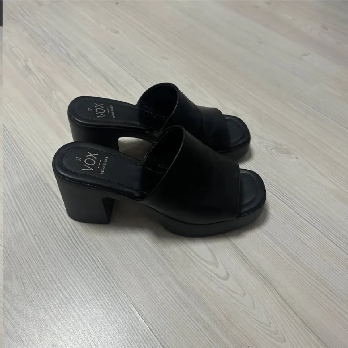 Svarta sandaler från Vox med bred rem över foten och öppen tå. Storlek 37. Nyskick.