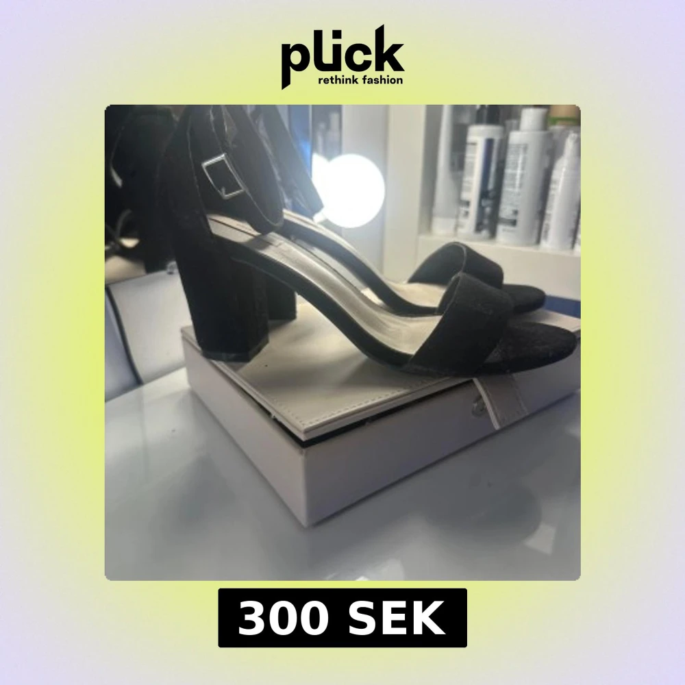 Stilrena svarta sandaler från Nelly med bred klack och öppen tå. Skorna har en enkel rem över tårna och justerbart spänne vid ankeln. Ytan är i mockaliknande material som ger en lyxig känsla. Perfekta för att lyfta vilken outfit som helst. Endast använda en gång