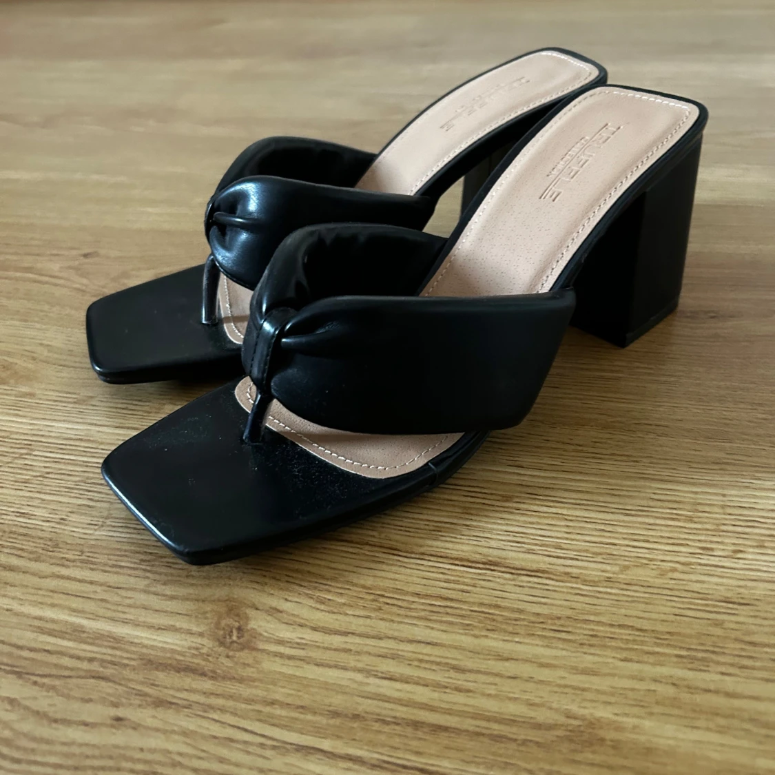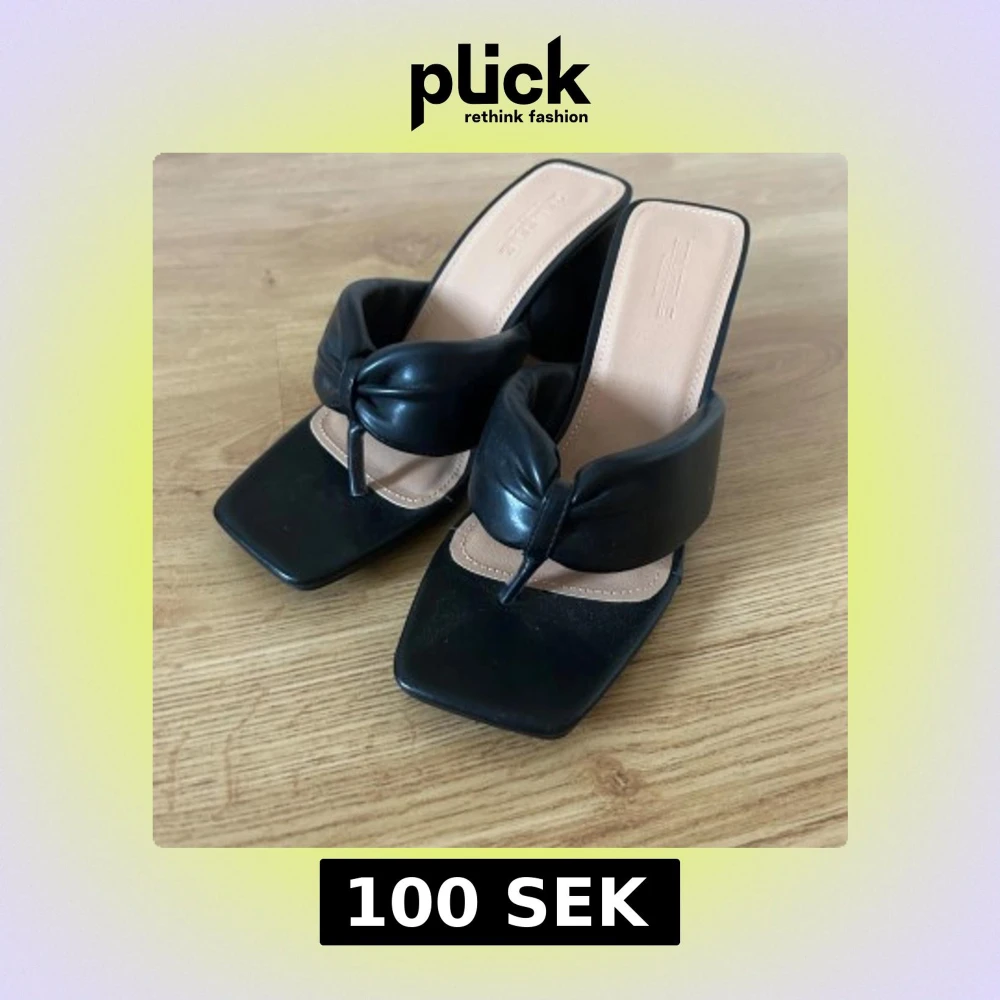 Säljer ett par svarta sandaler med breda remmar och snygg knutdetalj framtill. Skorna har fyrkantig tå och hög klack, vilket ger en trendig look. Helt oanvända. Köpta från Asos