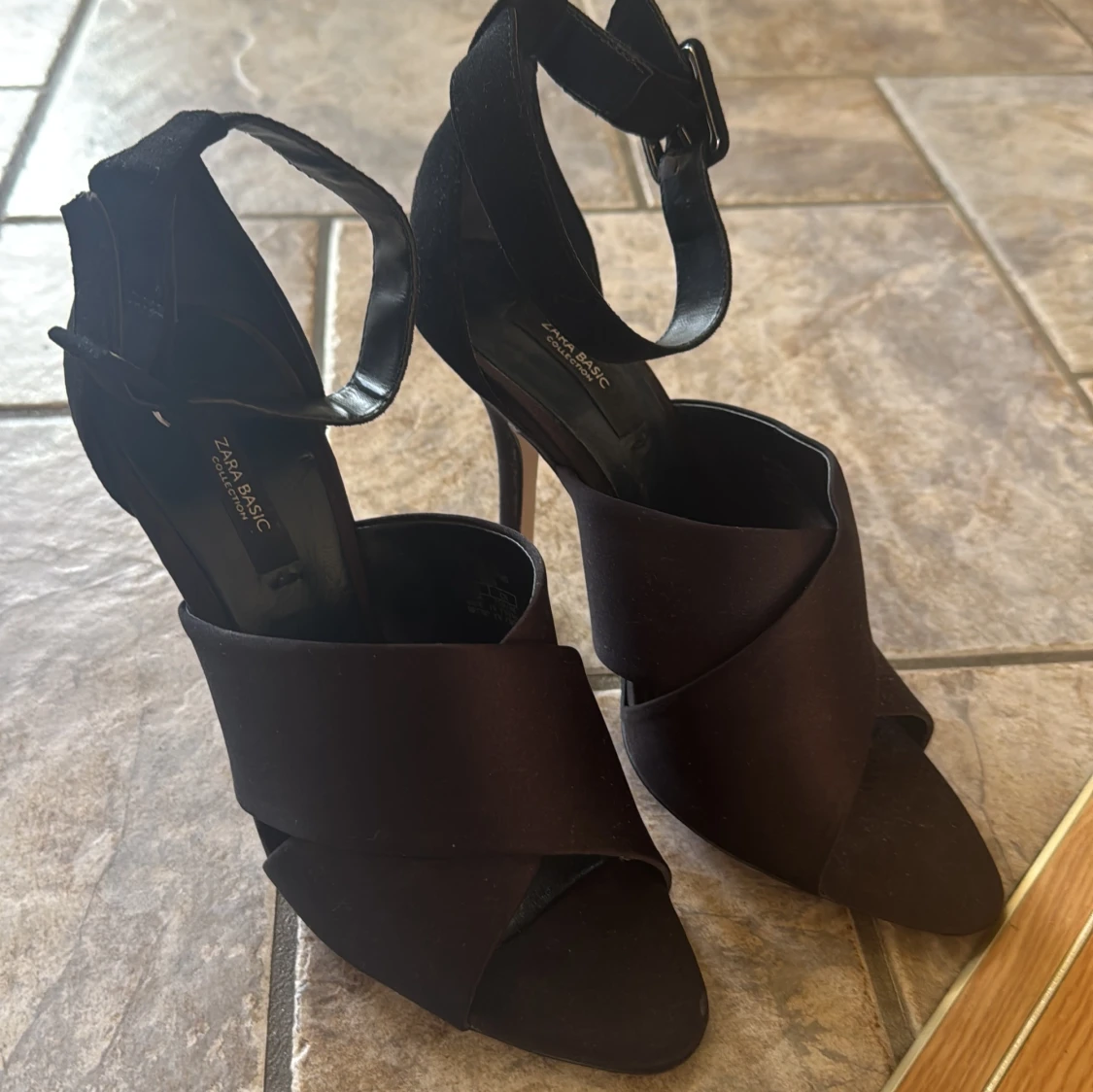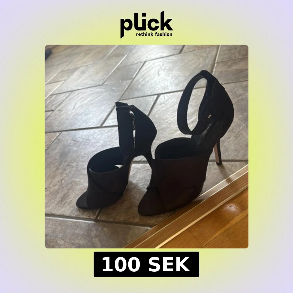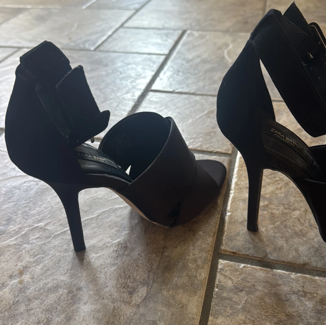 Snygga svarta klackar från Zara Basic med breda korslagda band över foten och öppen tå. Skorna har hög klack och justerbart ankelband med spänne. Tillverkade i ett matt tygmaterial som ger en stilren look.