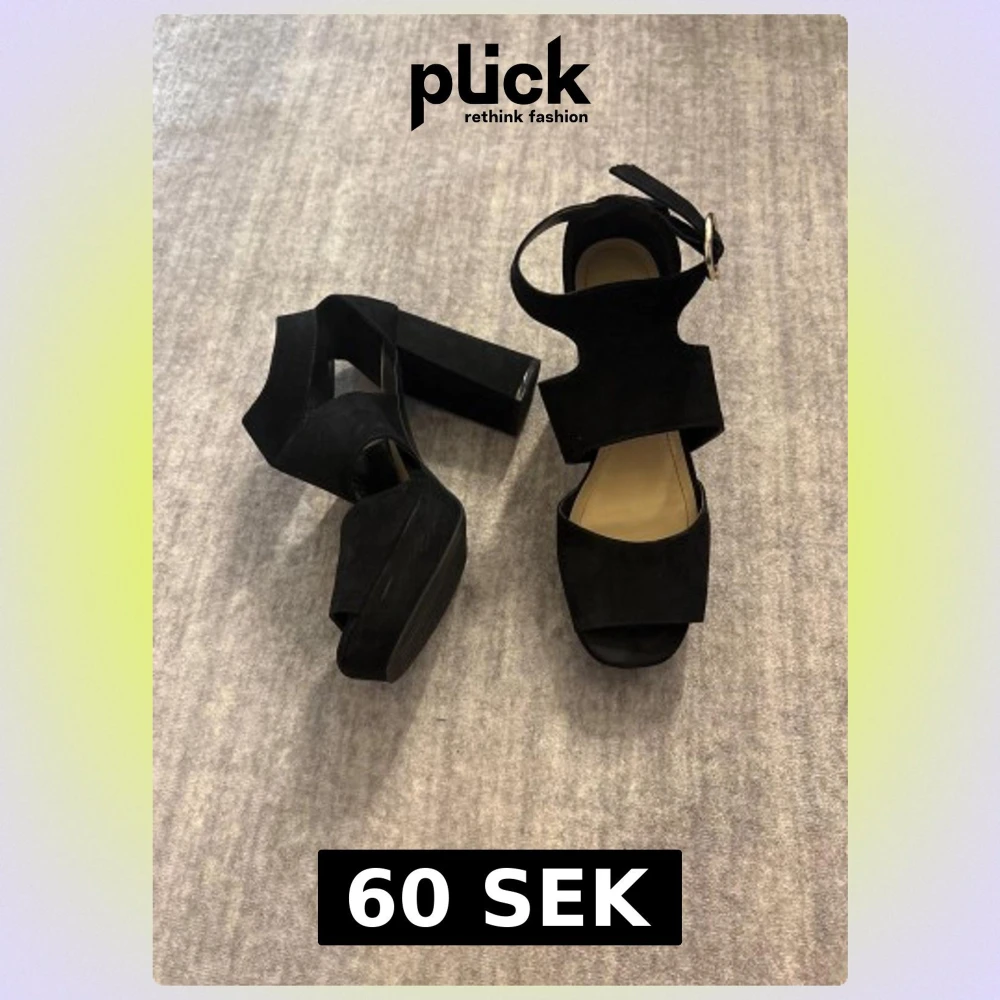 Säljer ett par svarta klackar med bred klack och plattform. Skorna har öppen tå och ett snyggt spänne runt ankeln. Materialet är mocka som ger en lyxig känsla och passar perfekt till dig som gillar statement-skor.