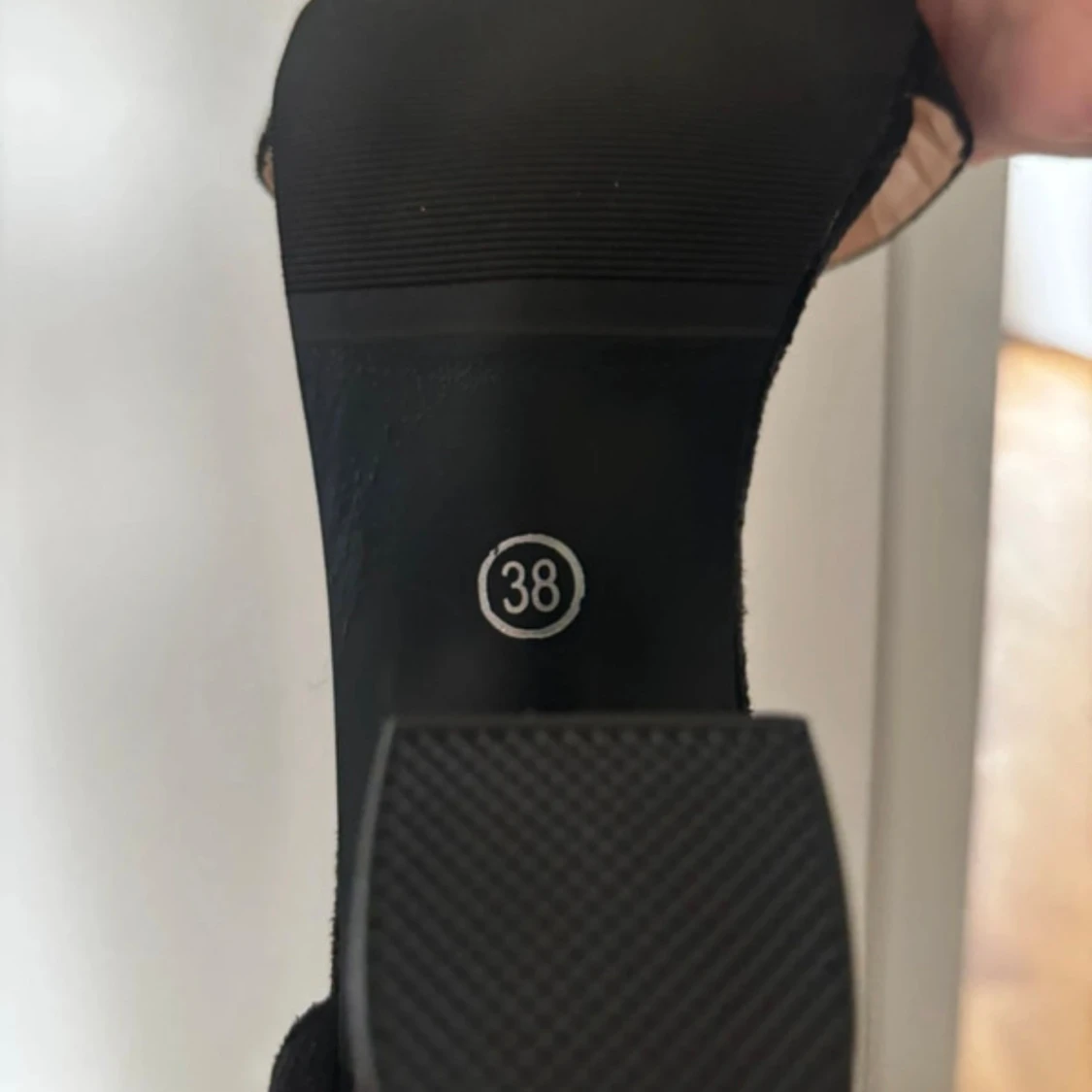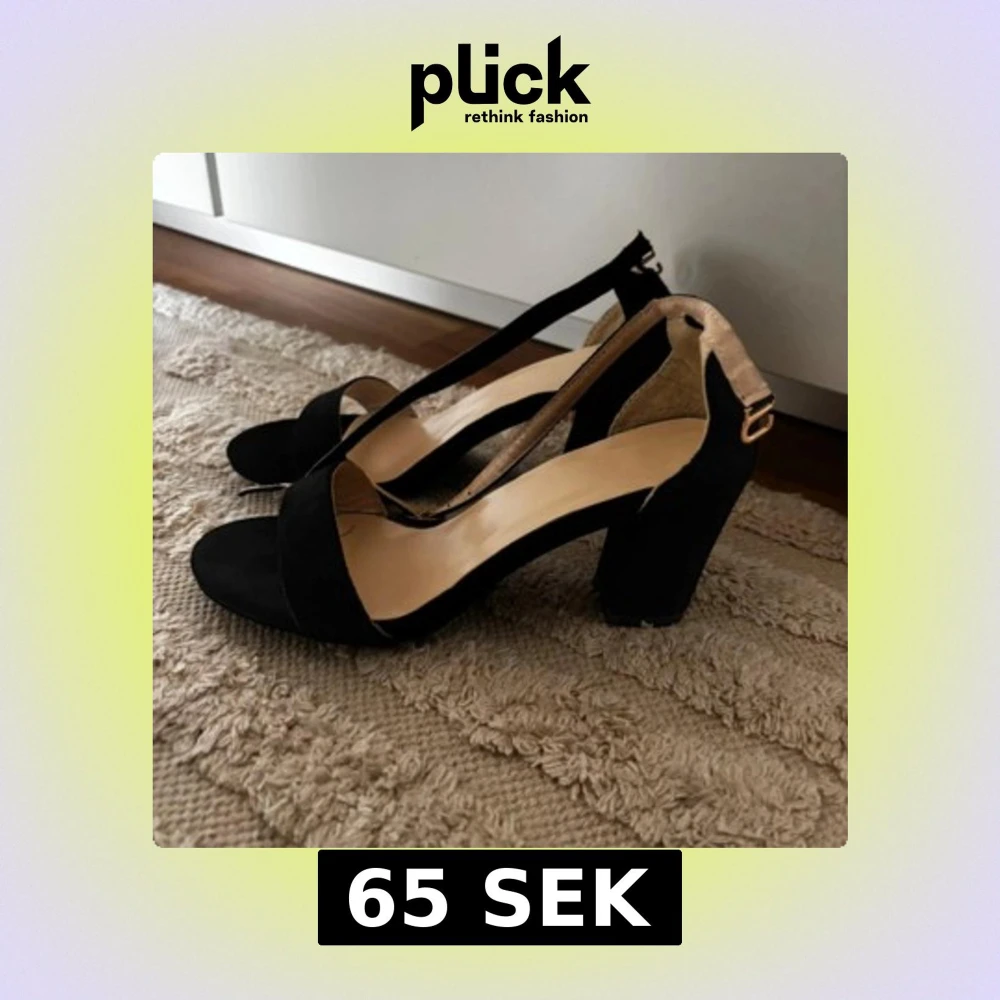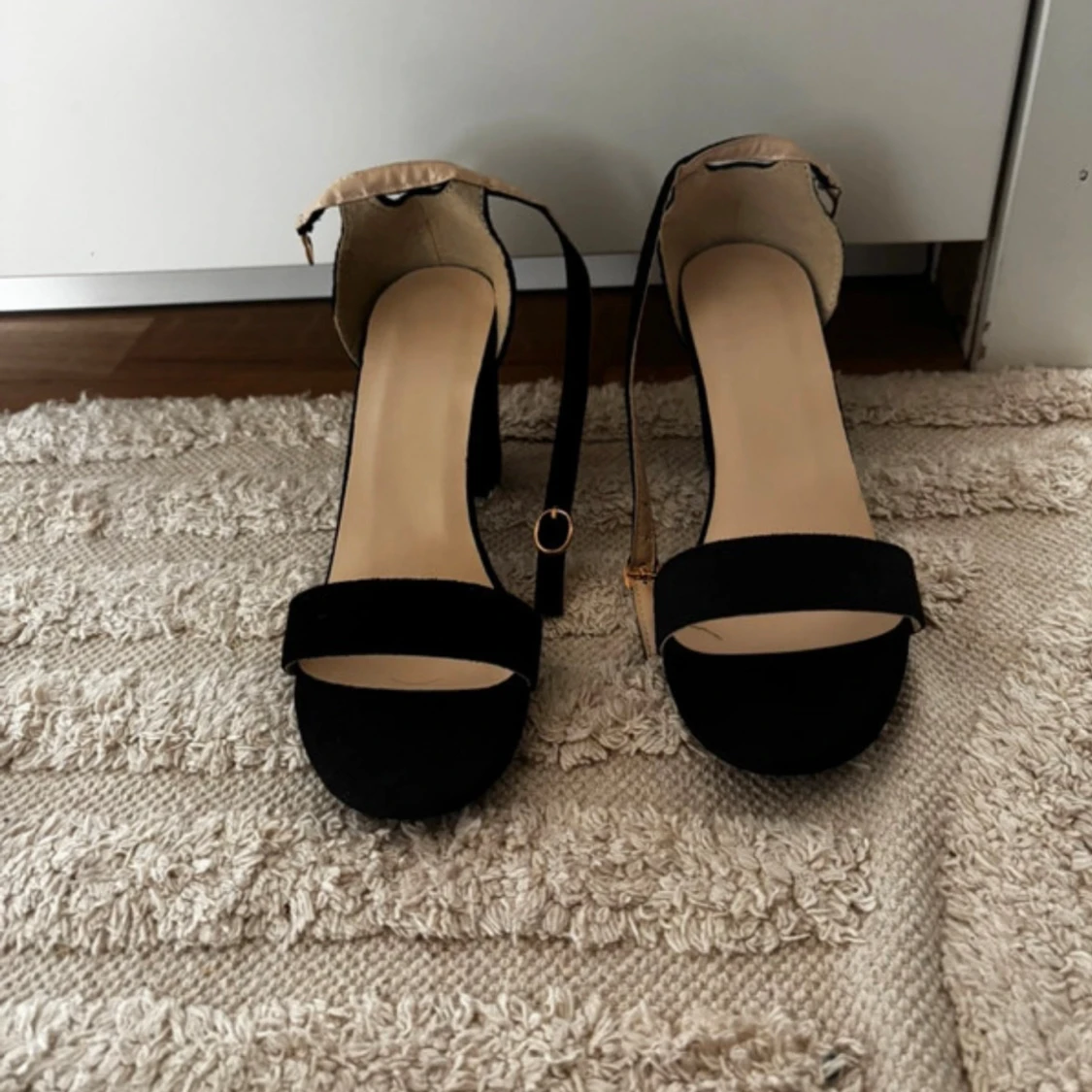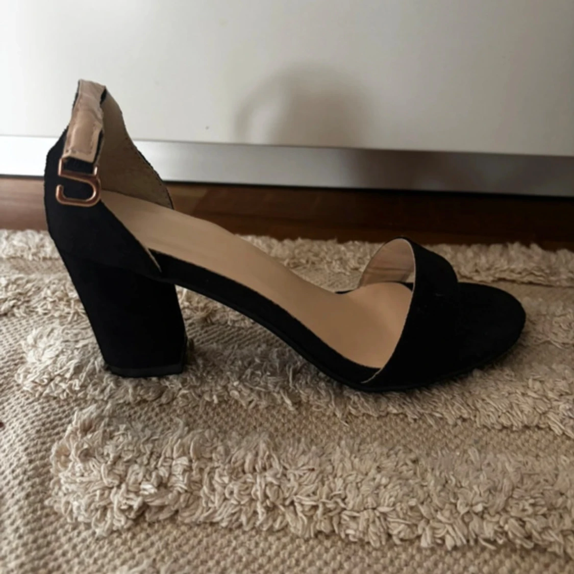 Stilrena svarta klackar. Skorna har en enkel rem över tårna och justerbart spänne vid ankeln i guldton. Tillverkade i mockaliknande material och passar perfekt när du vill lyfta din outfit. Aldrig använda då dem va för små för mig