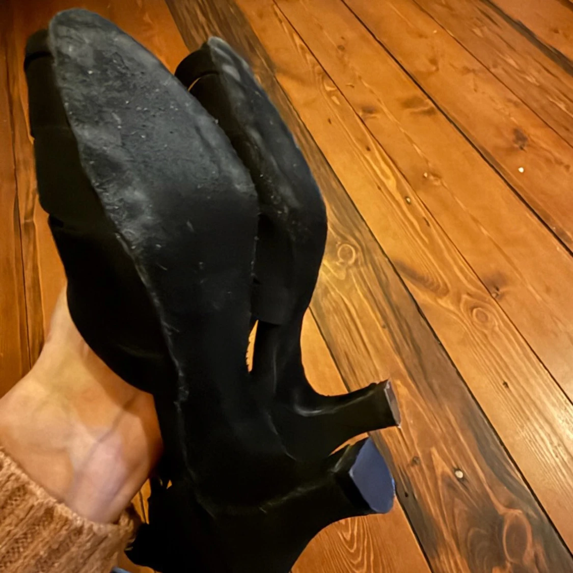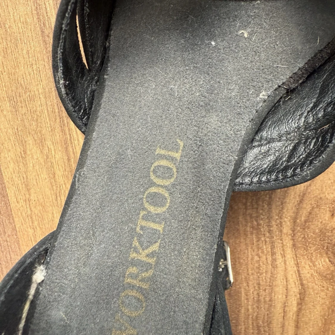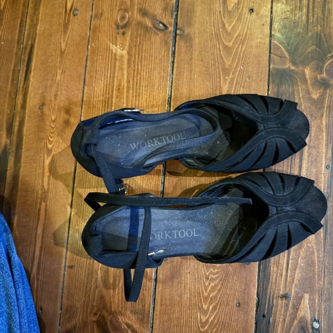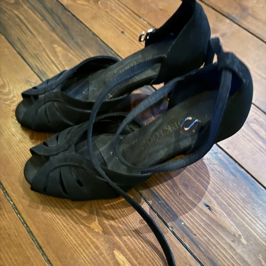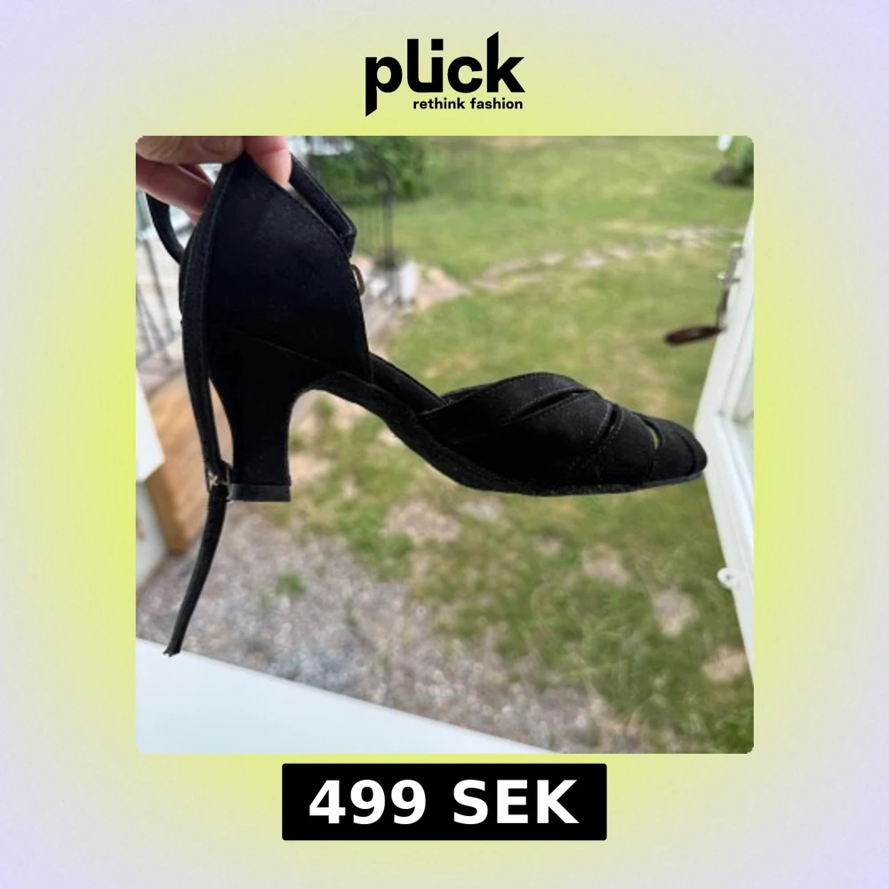 Svarta klackskor för dans eller användning i vardagen köpta i dansbutiken. Lite osäker på storlek men passar mig som har 36. Snygg design med remmar över foten och öppen tå. Skorna har en smal rem runt vristen med spänne och är tillverkade i mockaliknande material. Perfekta för dig som vill ha en elegant och stilren look.