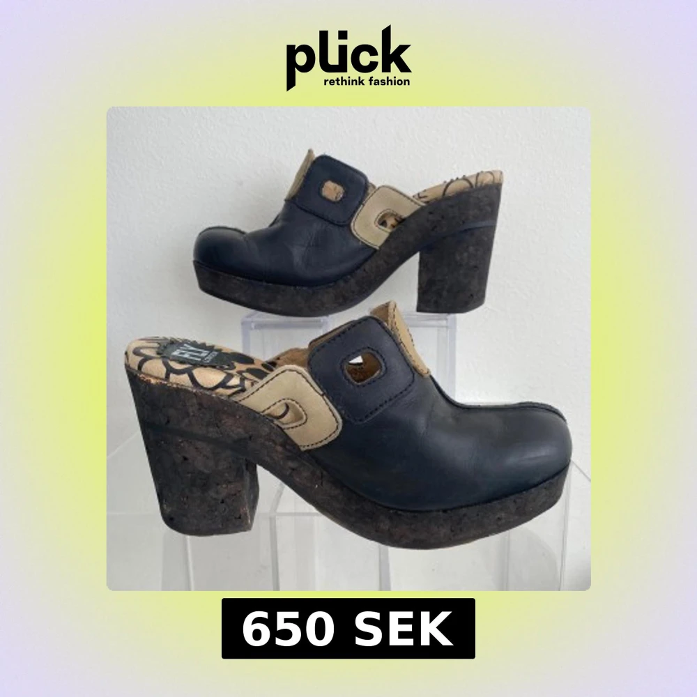 Snygga svarta klackskor från Fly London med beige detaljer och en unik mönstrad innersula. Skorna har en hög klack och en öppen häl, vilket ger dem en modern look. Såå snygga, ett måste till sommarens look!