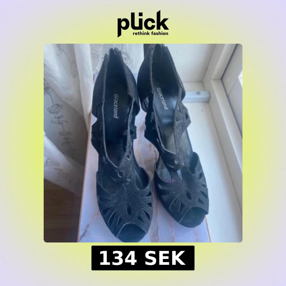 Säljer ett par svarta klackskor från Graceland med snygga utskurna detaljer och öppen tå. Skorna har en hög klack och dragkedja baktill för enkel på- och avtagning. Materialet är mocka och designen är riktigt stilren och edgy.knappt använda. Hämtas i norsborg botkyrka