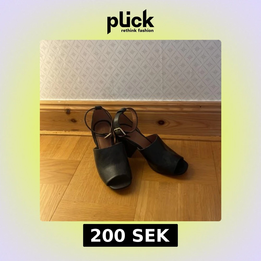Snygga svarta klackskor från H&M med öppen tå och justerbart spänne runt ankeln. Skorna har en bred klack som ger stabilitet och komfort. Perfekta för att ge en elegant touch till din outfit.