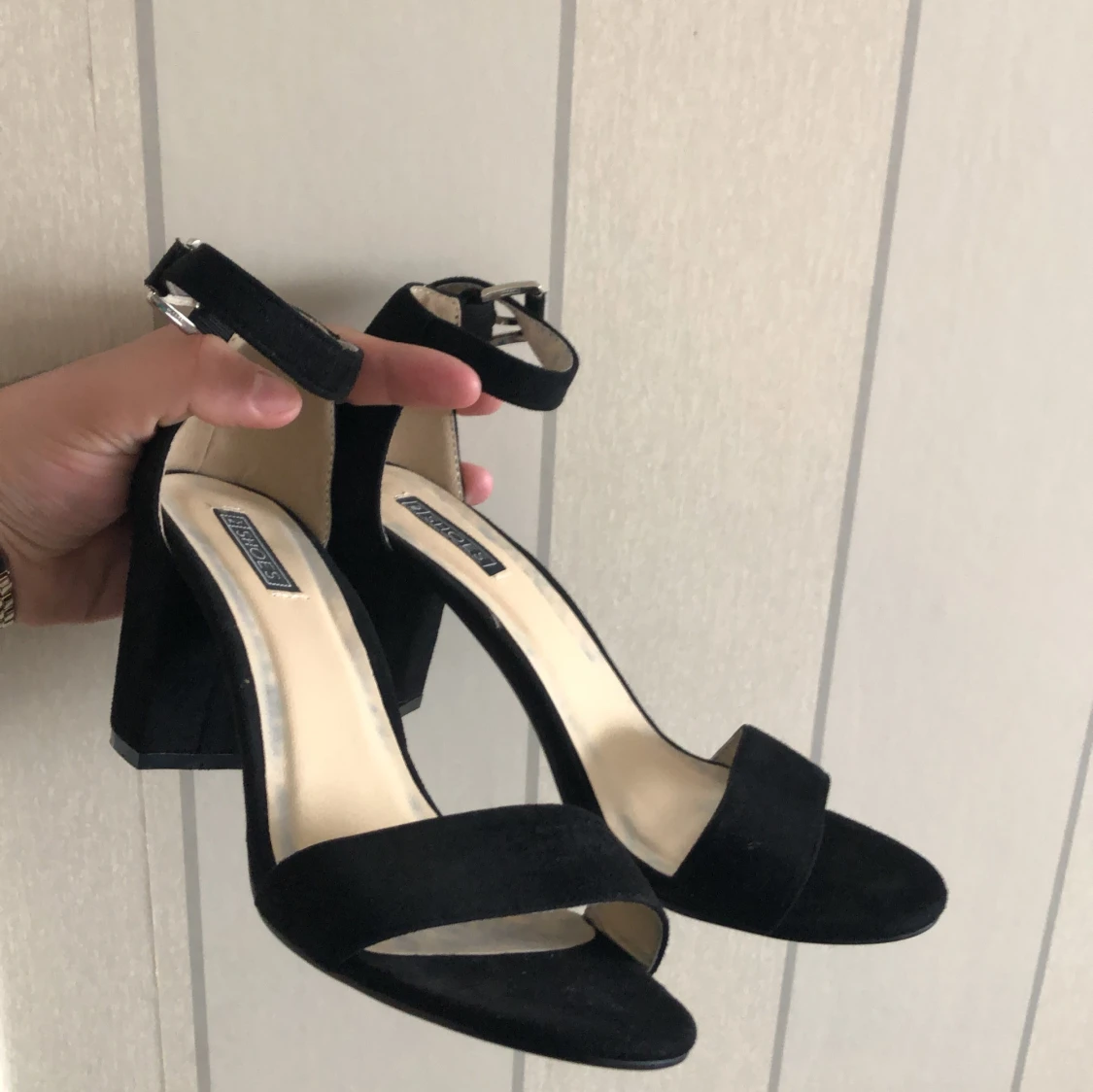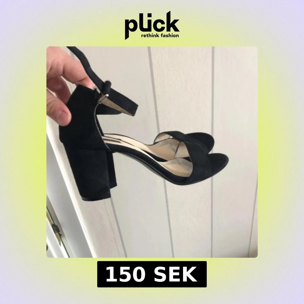 Säljer ett par svarta klackskor med öppen tå och bred klack. Skorna har en stilren design med rem över tårna och justerbar ankelrem. Perfekta för dig som vill ha både stil och komfort.