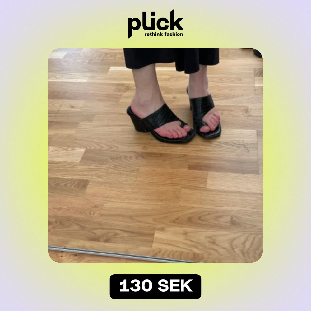 Säljer ett par snygga svarta klackskor med en cool krokodilmönstrad yta. De har en öppen tå och en bred klack som ger bra stabilitet. Perfekta för en utekväll eller fest! 🖤