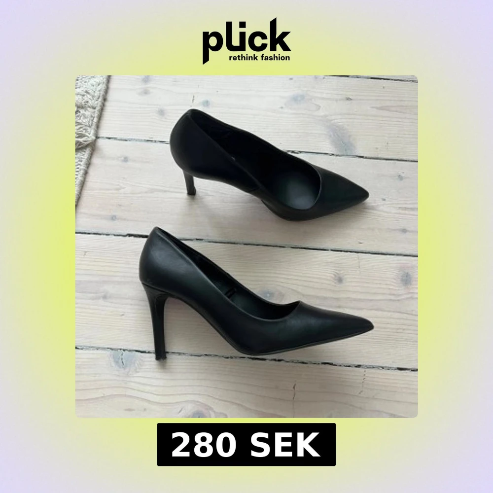 Svarta pumps med spetsig tå och hög klack. Endast använda vid 1 tillfälle. Sköna att gå i. Säljer endast då de är för stora