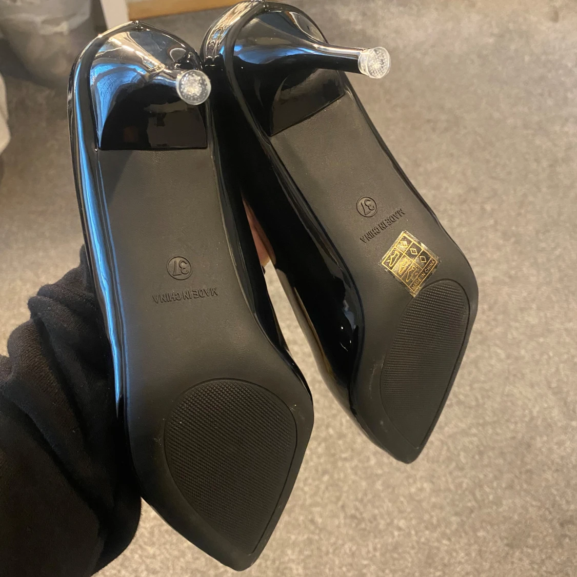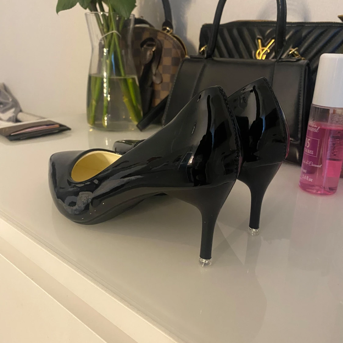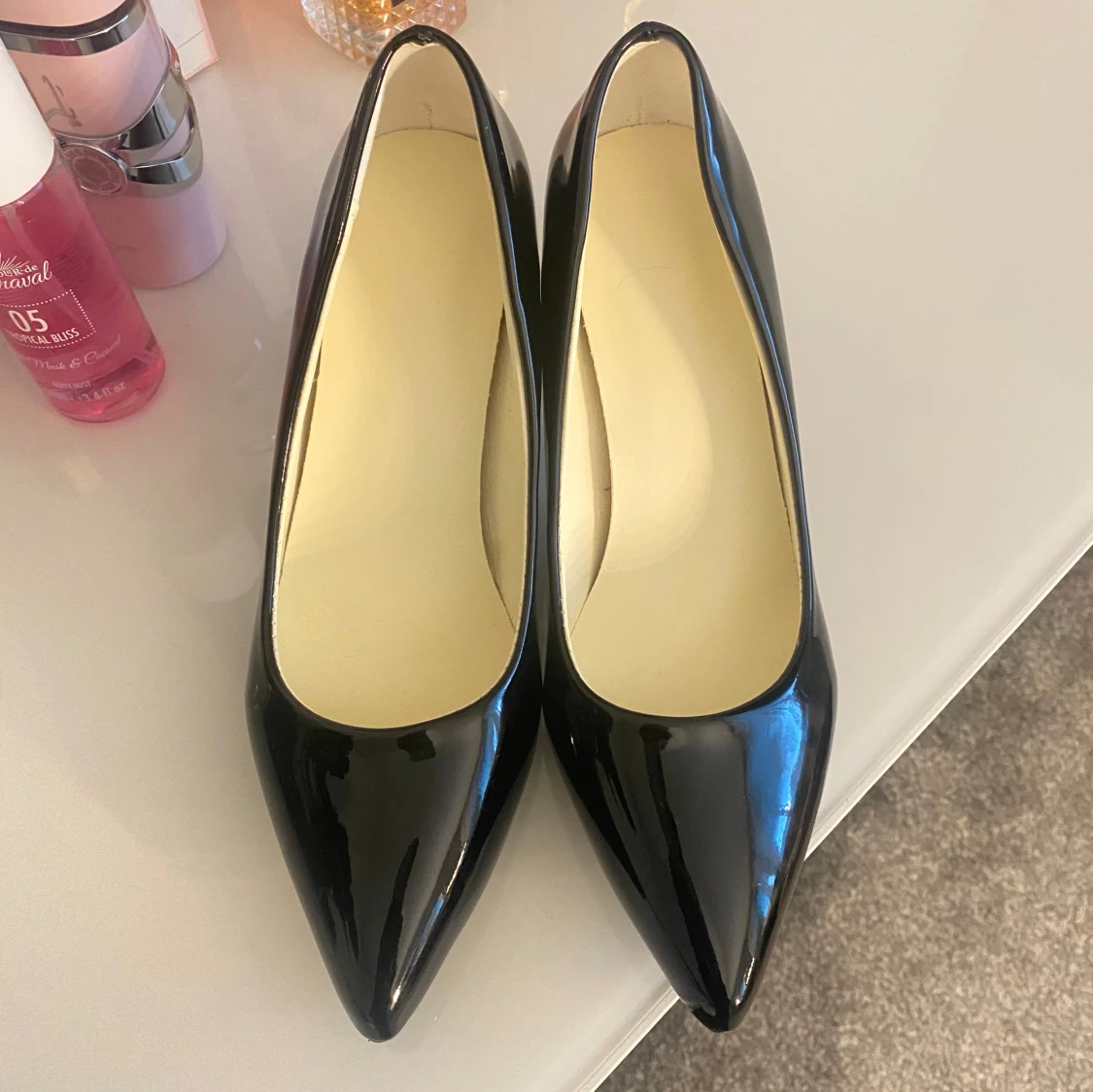 Klassiska svarta pumps i glansigt syntetmaterial med spetsig tå och smal klack. Aldrig använda pga dem ej passar 💗