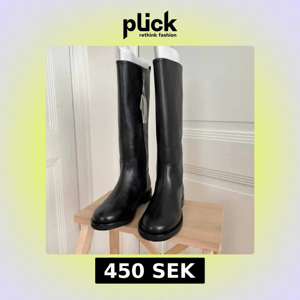 Stilrena svarta stövlar från Zara i läder med dragkedja på insidan. Modellen är knähög med platt sula och rund tå, perfekt till höstens outfits. Snygg minimalistisk look som funkar till många stilar.
