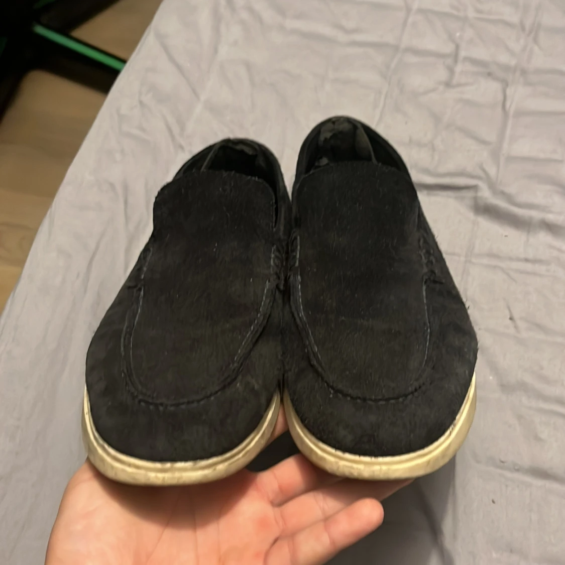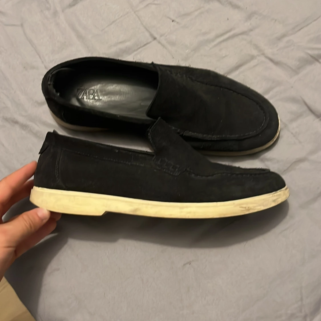 Snygga svarta loafers från Zara i mocka med en stilren design. Perfekta för en avslappnad men ändå elegant look. De har en vit sula som ger en fin kontrast till det svarta.