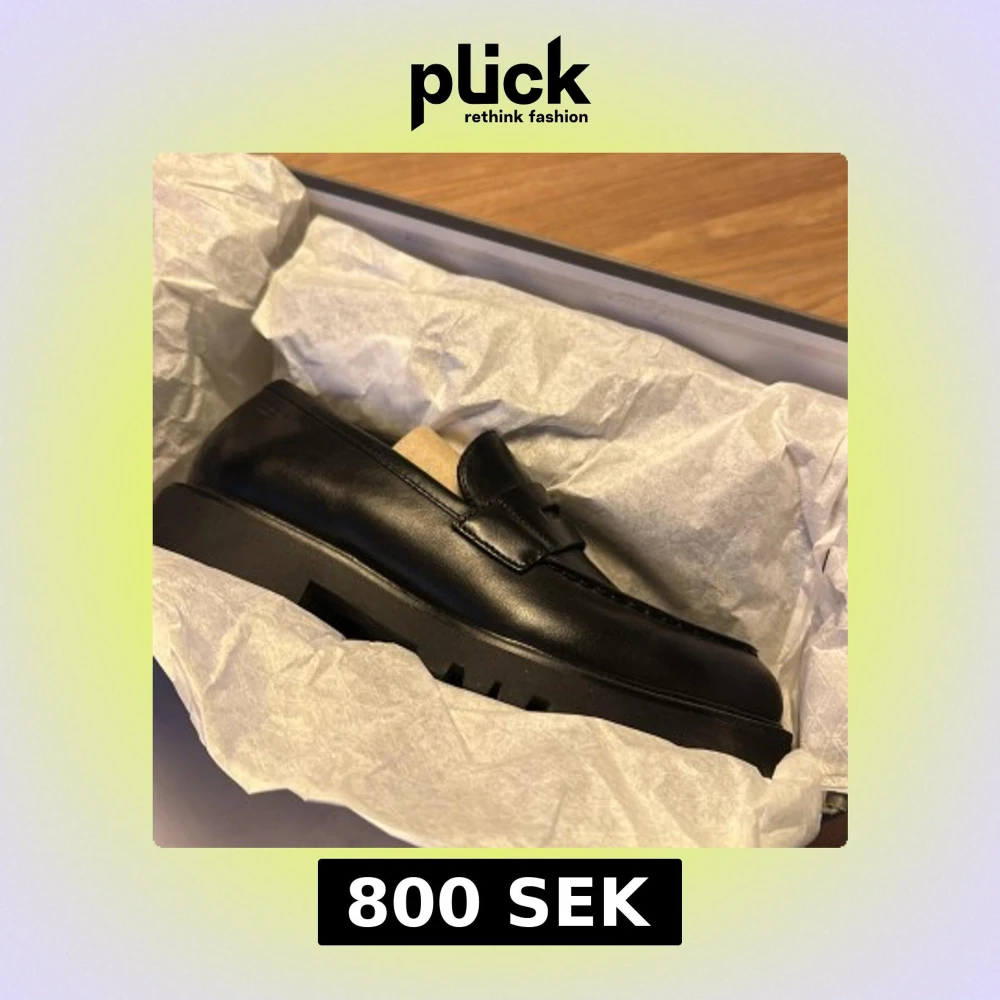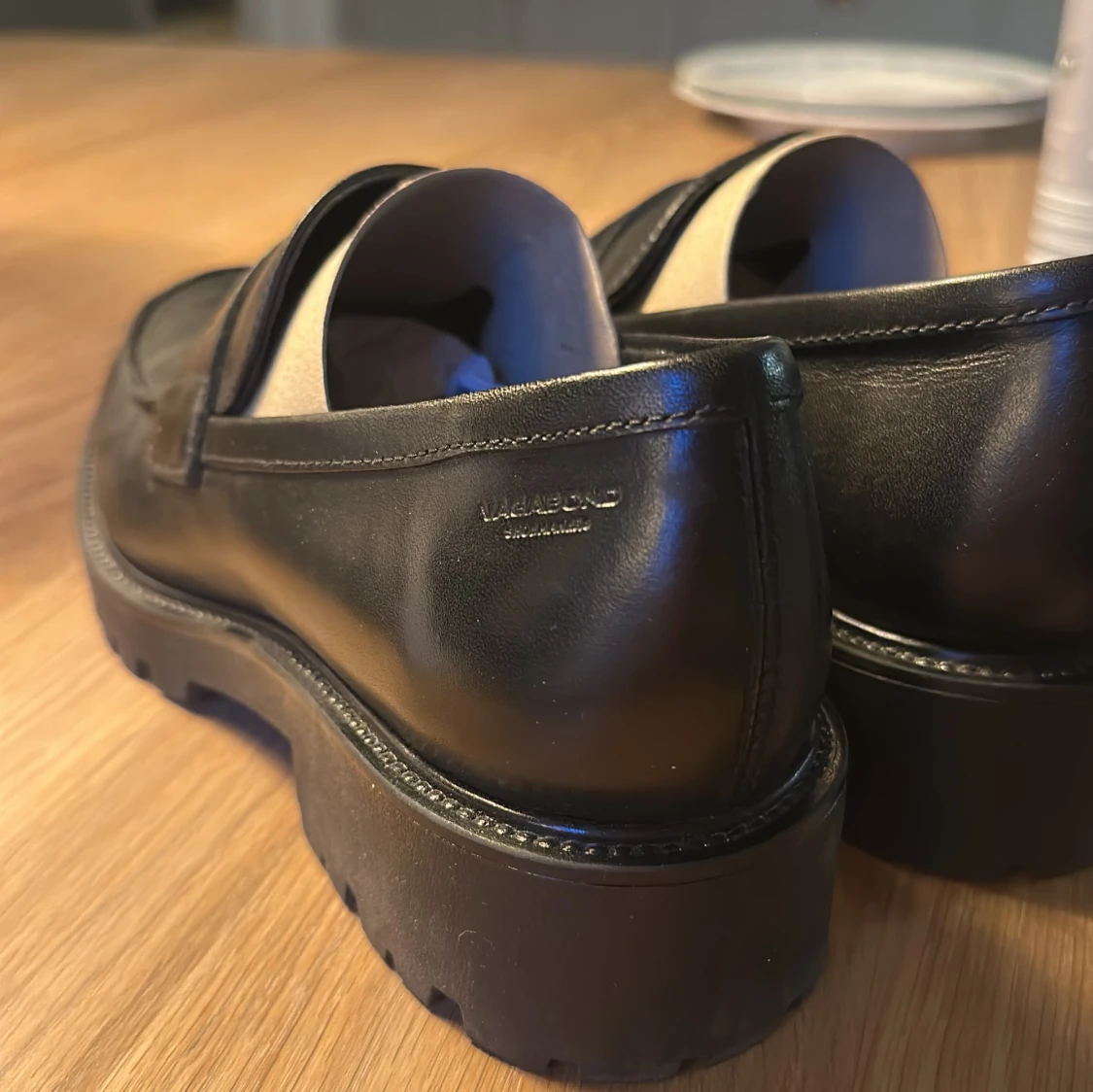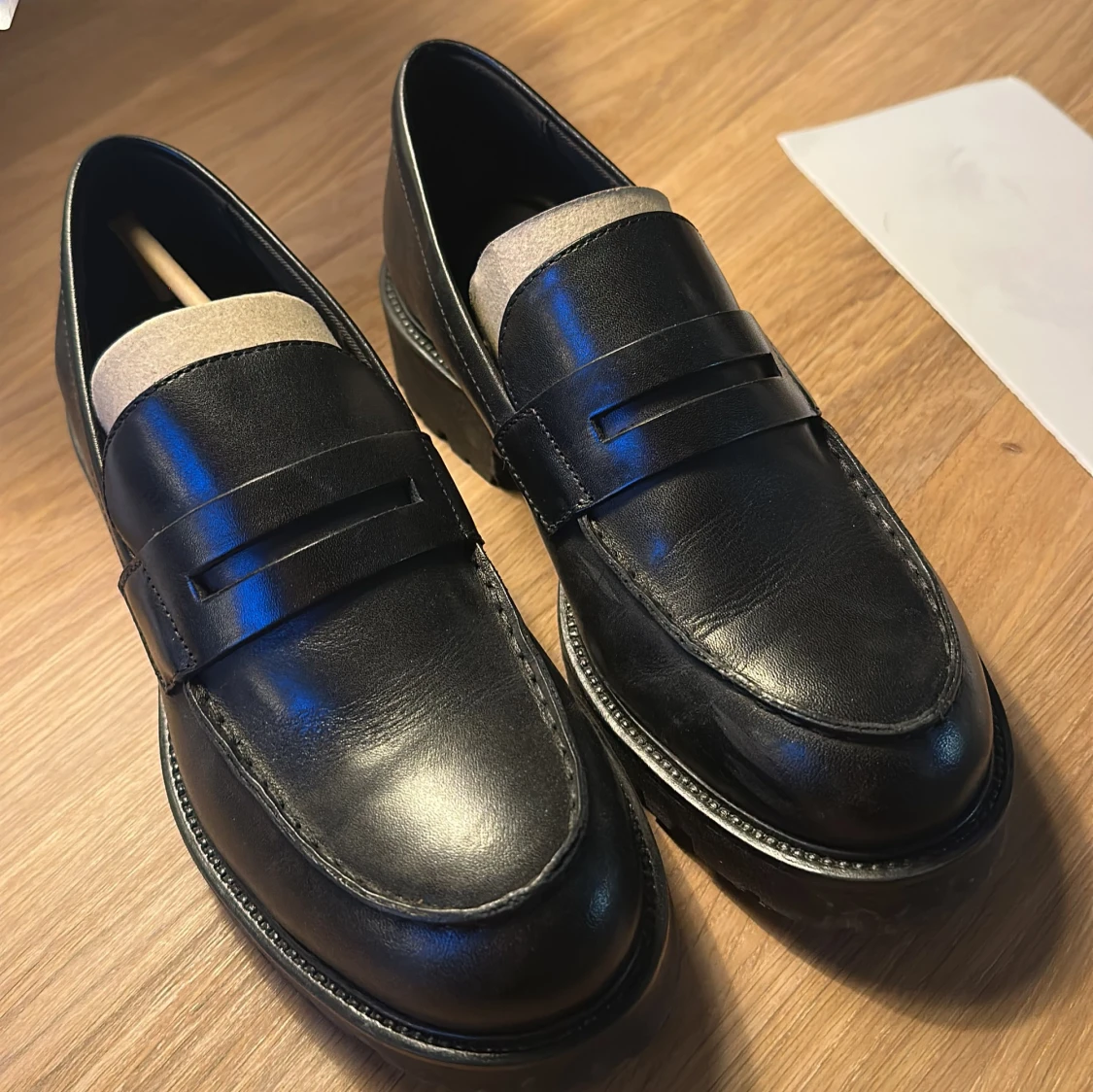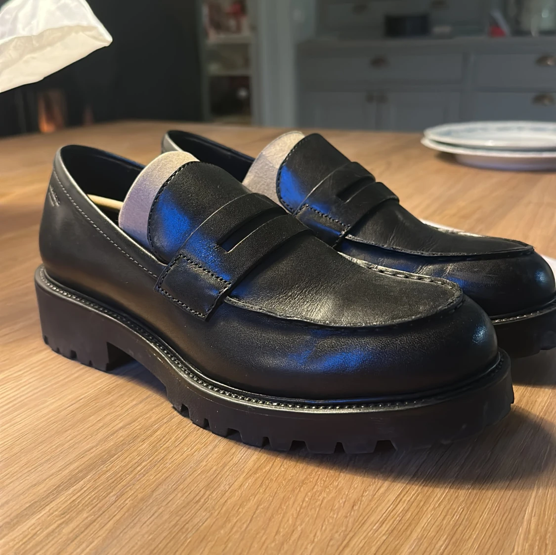 Säljer ett par svarta loafers från Vagabond, modell Kenova. Skorna har chunky platt sula med grovt mönster, rund tå och klassisk pennyloafers-detalj. Tillverkade i slätt skinn som ger en stilren och modern look. Perfekta för dig som gillar tidlös design med edge.