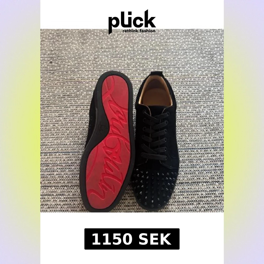 Säljer ett par svarta sneakers från Christian Louboutin i mocka med coola svarta nitar på tån och den ikoniska röda sulan. Skorna har snörning och en rund tå, vilket ger en edgy och lyxig vibe. Perfekta för dig som vill sticka ut med din stil.