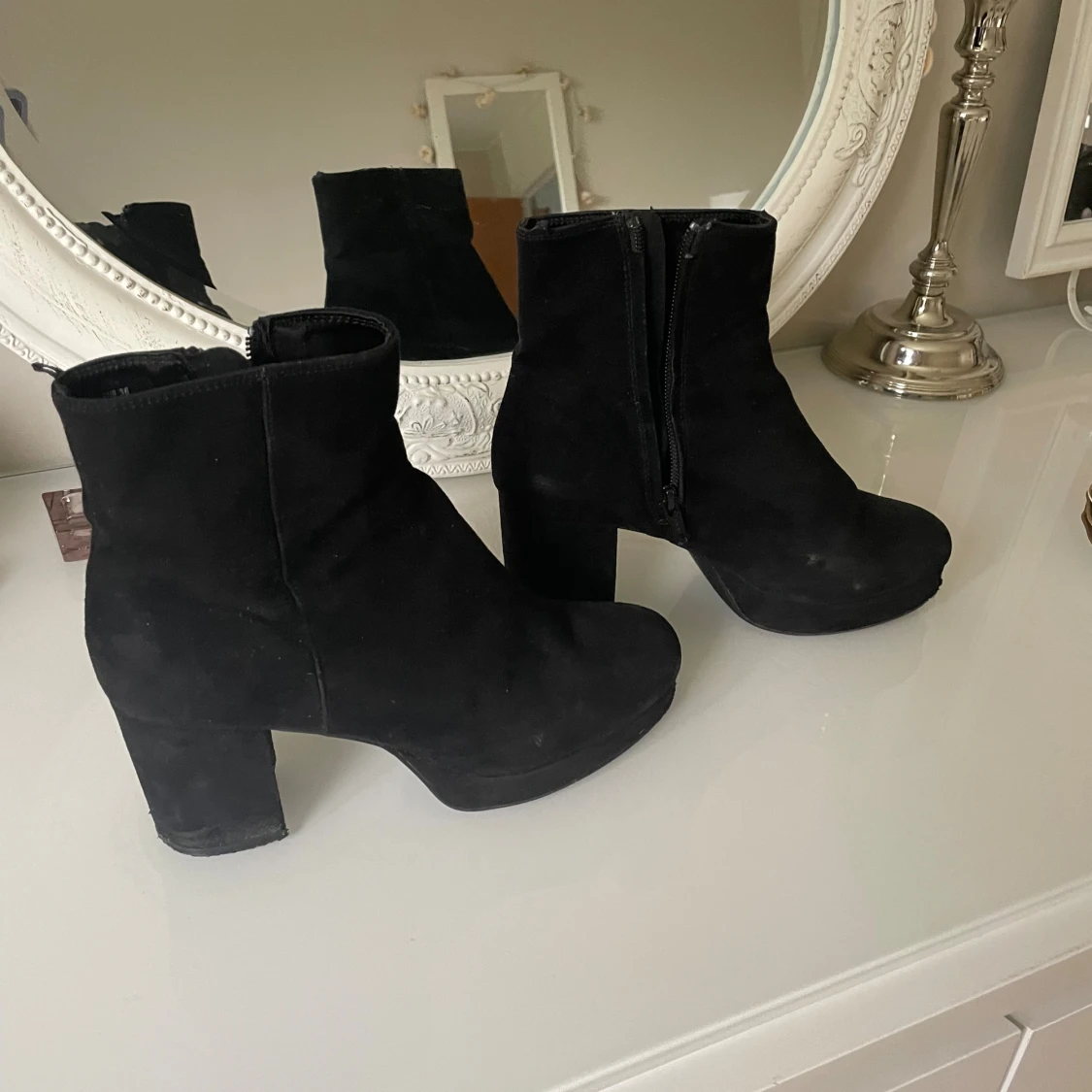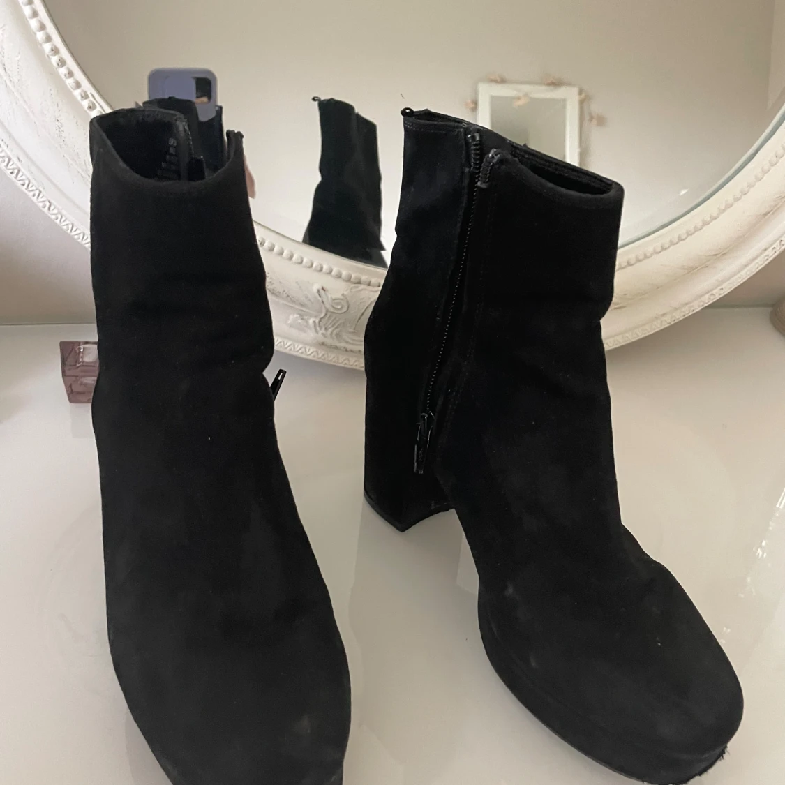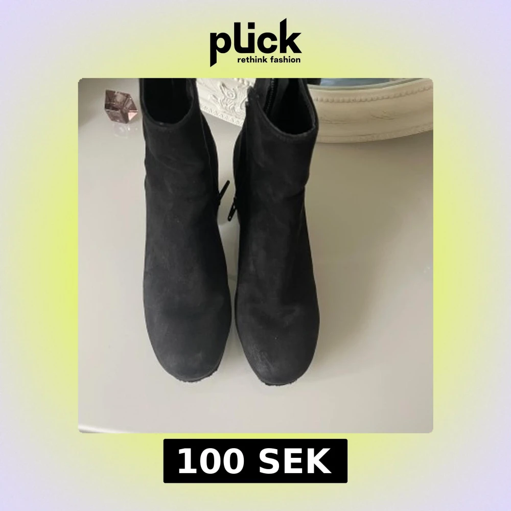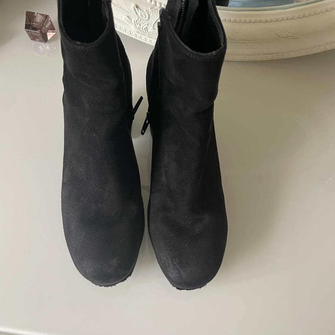 Säljer ett par svarta boots i mockaimitation från H&M med chunky klack och rund tå. Skorna har dragkedja på insidan för enkel påtagning och en stilren, minimalistisk look som passar till många outfits.