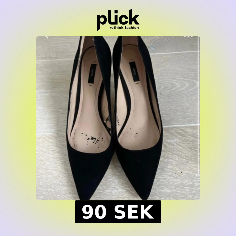 Stilrena svarta pumps från Mango i mocka med spetsig tå och låg klack. Klassisk och elegant design som passar till många olika outfits. Skorna har en smal siluett och är helsvarta både på utsidan och klacken. Använt skorna en gång men var aldeles för små, ser rätt slitna ut inget men ser när skorna är på