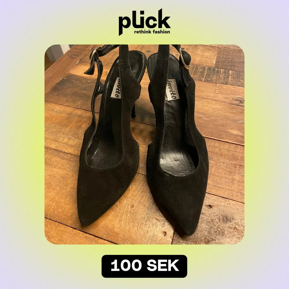 Snygga svarta pumps i mocka med spetsig tå och elegant klack. De har en justerbar rem med guldfärgat spänne för perfekt passform. Perfekta för en utekväll eller fest! Skorna är i bra skick med lite slitage på sulan.