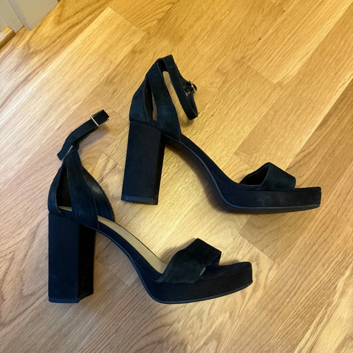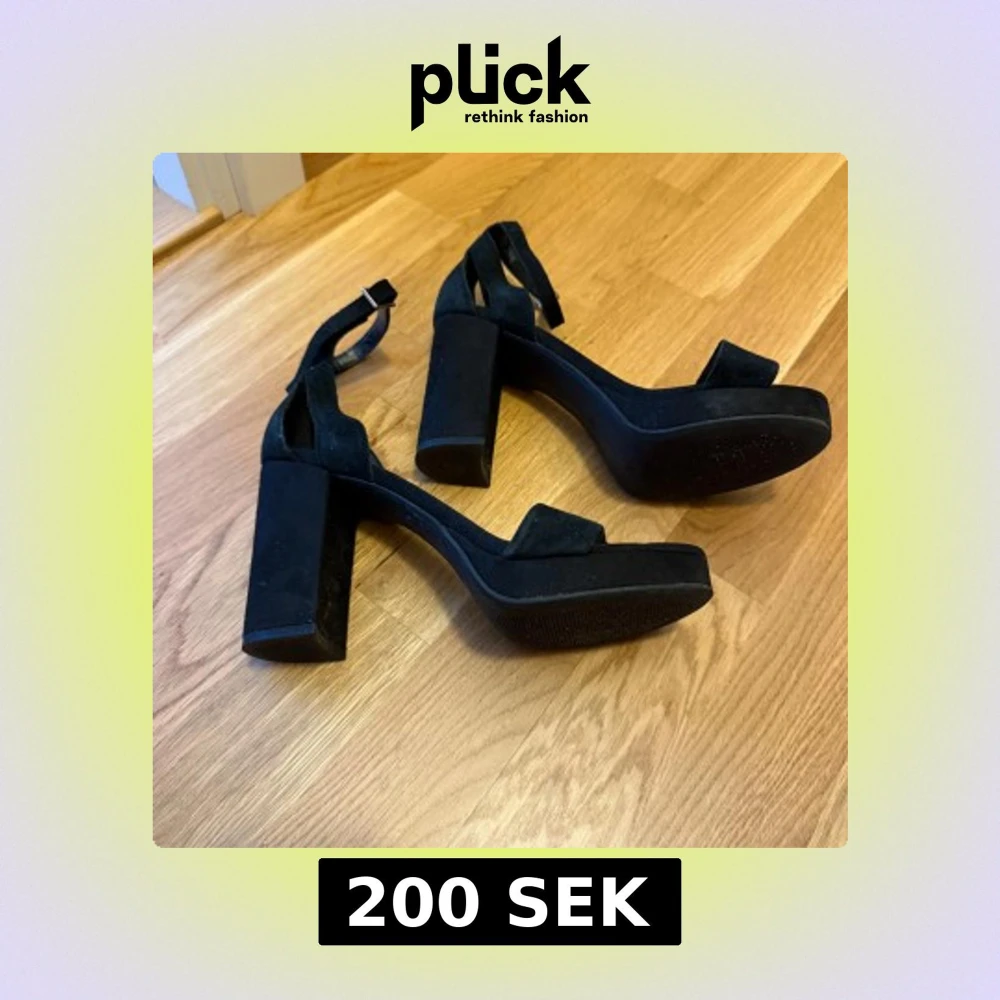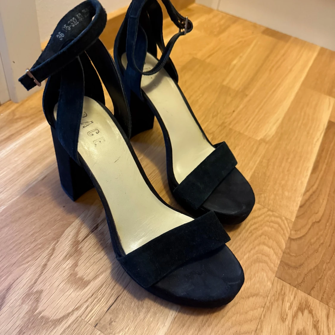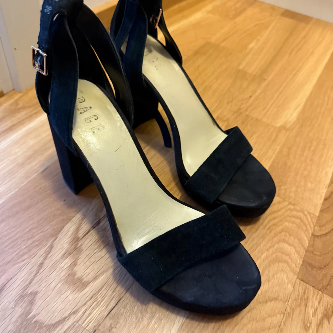 Snygga svarta sandaler från Pace i mjuk mocka med bred klack och plattform. Skorna har öppen tå, justerbart spänne runt ankeln och stilren design som ger en cool vibe. Perfekta för dig som gillar att sticka ut med chunky klackar och minimalistisk look.