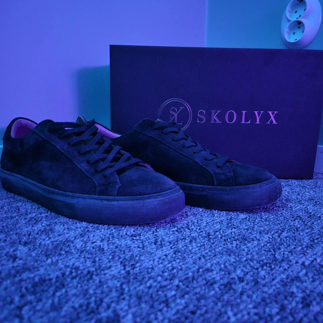 Snygga svarta sneakers från Skolyx i mjuk mocka med klassisk rund tå och platt sula. Skorna har snörning och en stilren design som passar perfekt till jeans eller chinos. Levereras med originalkartong.