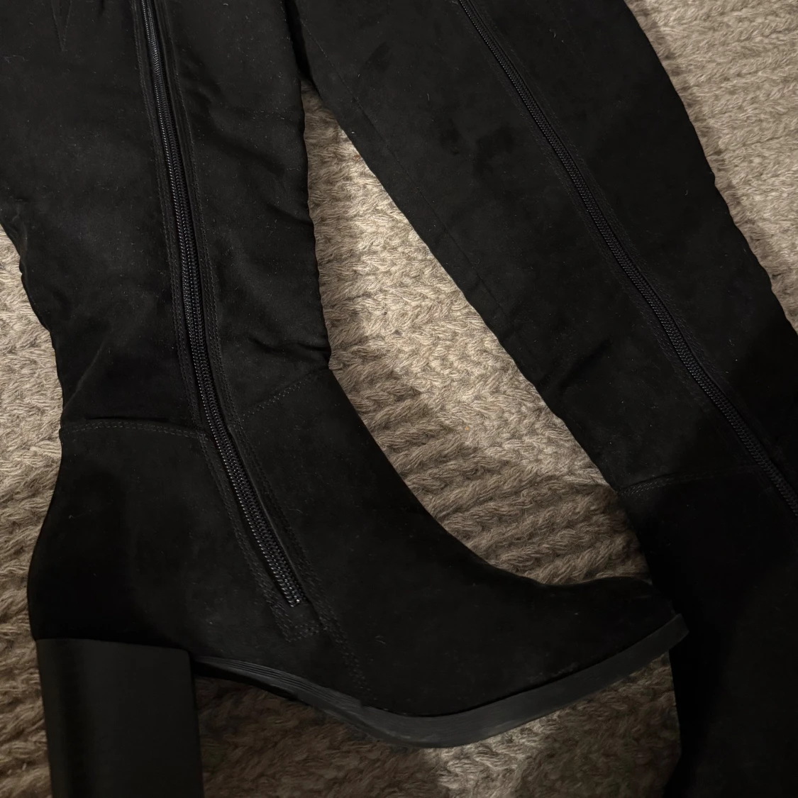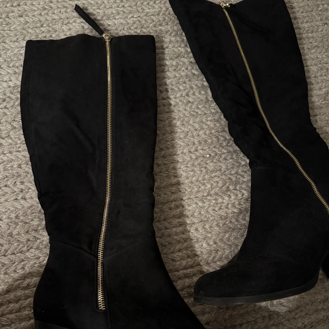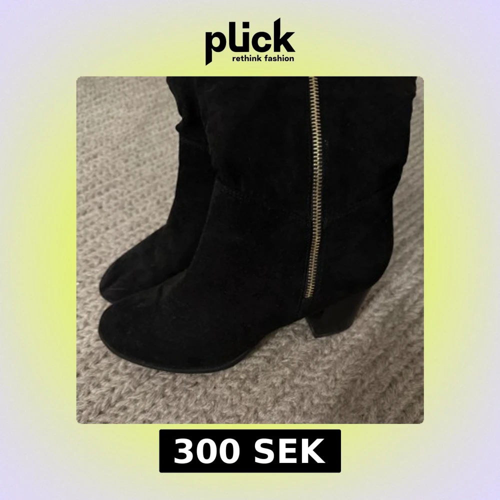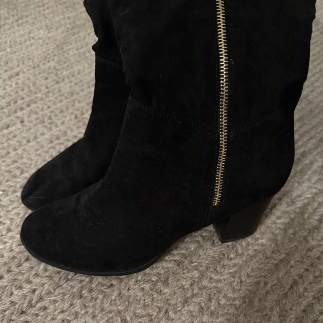 Snygga svarta stövlar i mocka med markerad klack och dragkedja längs sidan. Stövlarna har en klassisk rund tå och en stilren look som passar perfekt till höst- och vinteroutfits. Dragkedjan i guld ger en extra detalj till designen.