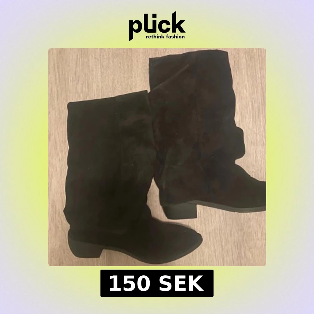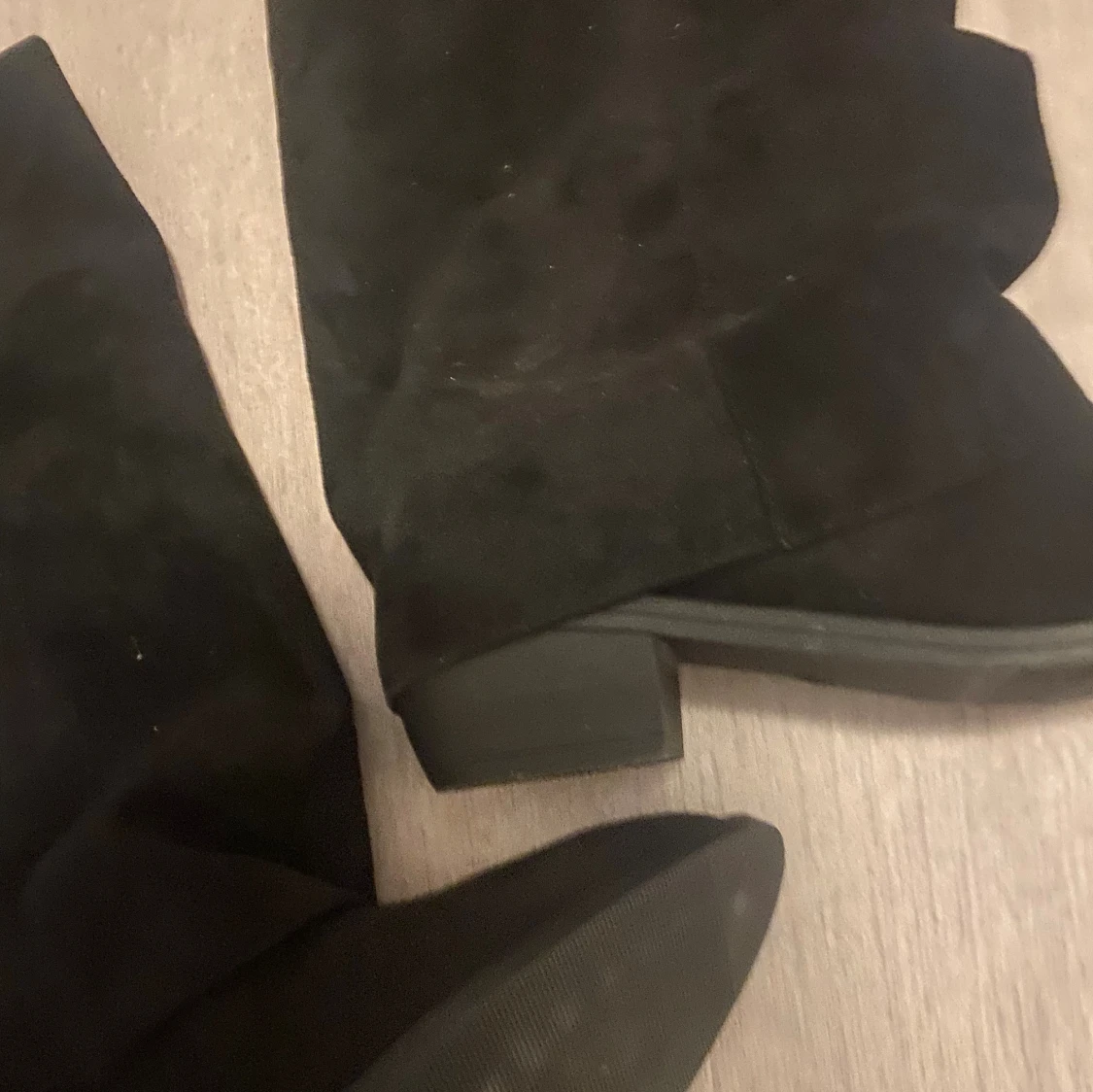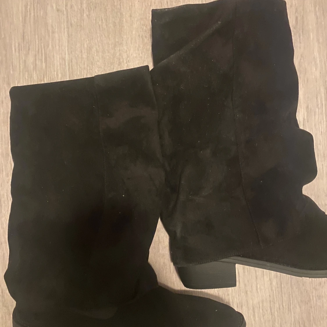 Säljer ett par svarta stövlar i mocka med låg klack och rund tå. De har en klassisk och enkel design som passar till många olika outfits. Perfekta för höst och vinter när du vill ha både stil och komfort.
