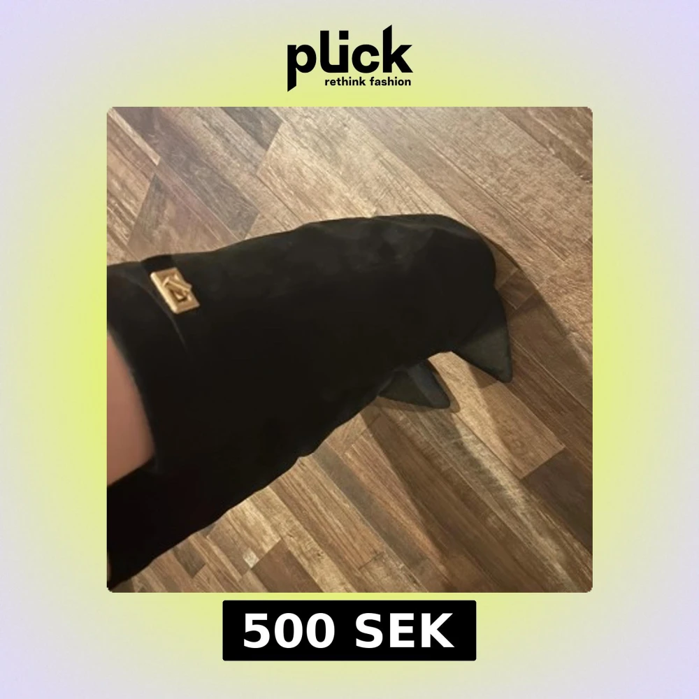 Säljer ett par svarta stövlar i mocka med snygg spetsig tå och hög klack. Stövlarna har en elegant gulddetalj upptill som ger en lyxig känsla. Perfekta för dig som vill sticka ut med en stilren och trendig look.