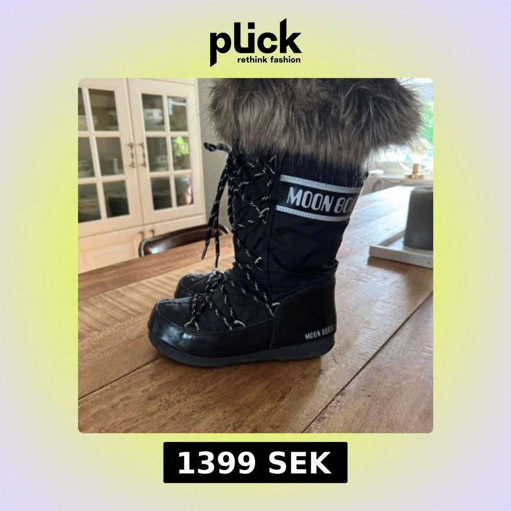 Säljer ett par svarta Moon Boot med fuskpäls upptill och snörning framtill. Skorna har en hög modell och tydlig logga på sidan. Perfekta för kalla dagar och vinterns äventyr.