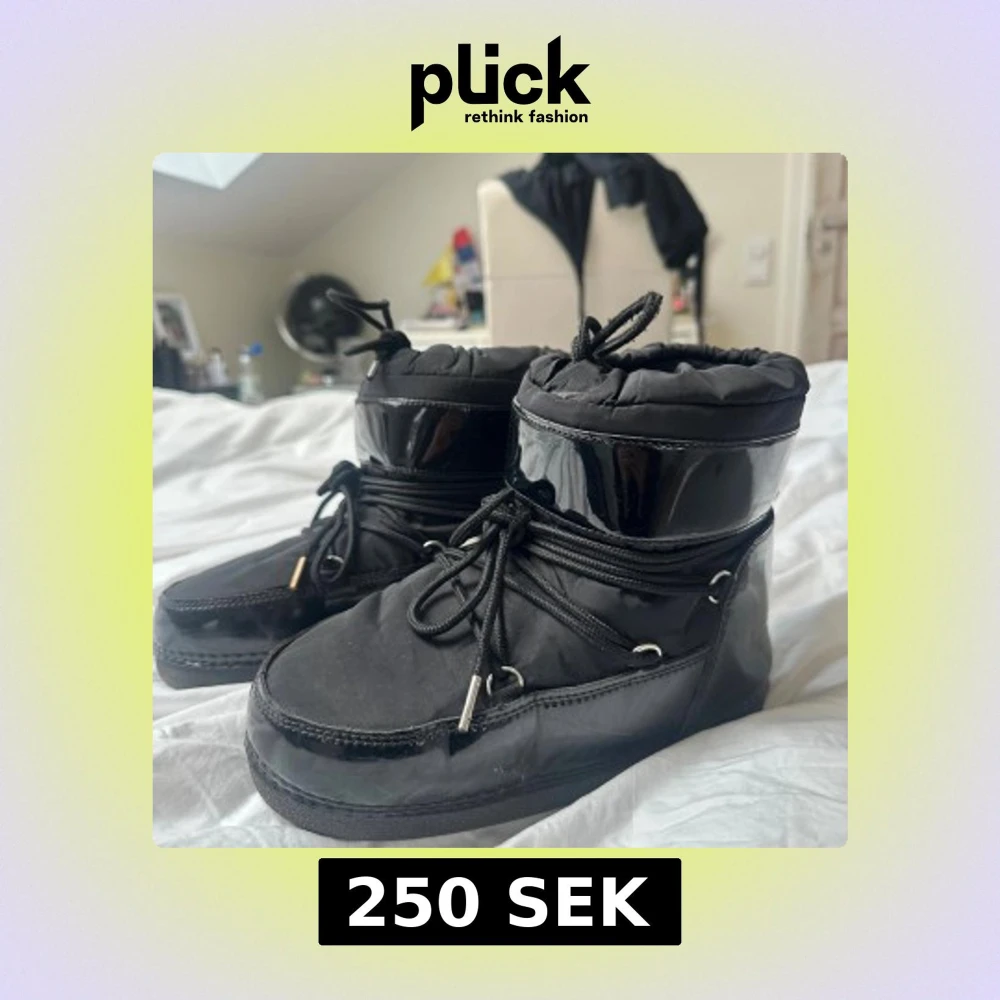 Säljer ett par svarta moon boots från VOX i storlek 37/38. Köptes från DIN SKO. Skorna har glansiga detaljer, snörning runtom och är fodrade för extra värme. Yttermaterialet är syntet och de har en platt sula. Perfekta för kalla dagar när du vill hålla stilen.