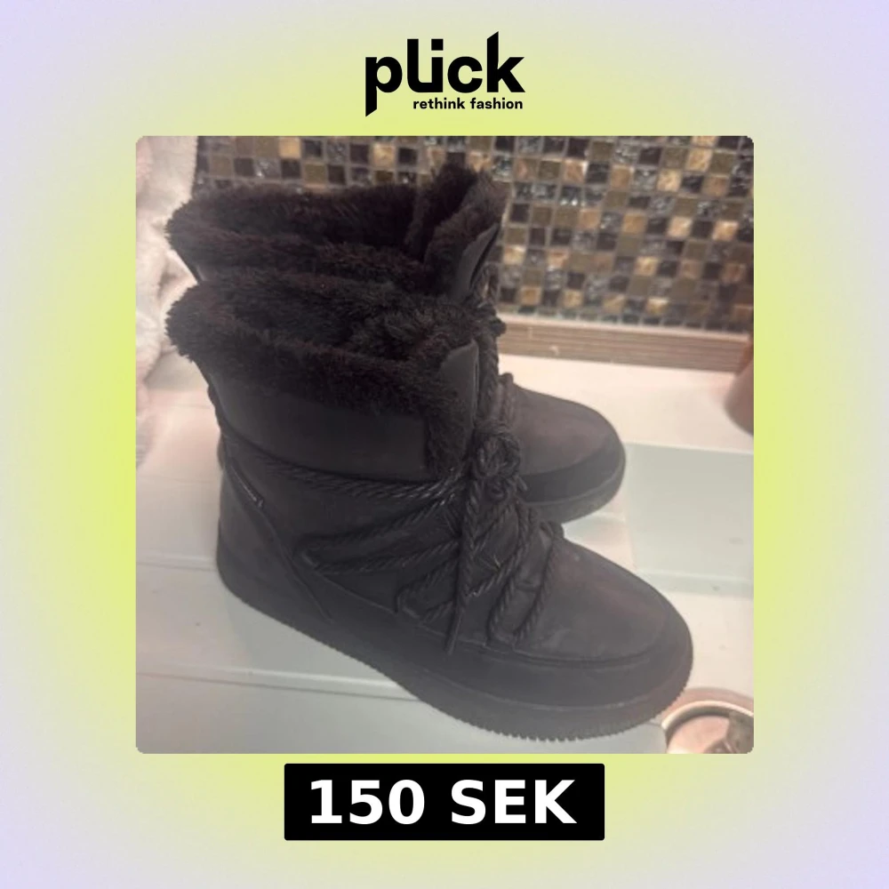 Säljer ett par svarta boots moon-boots-stil med mjukt pälsfoder och snörning. Perfekta för kalla vinterdagar med sin varma och bekväma design.