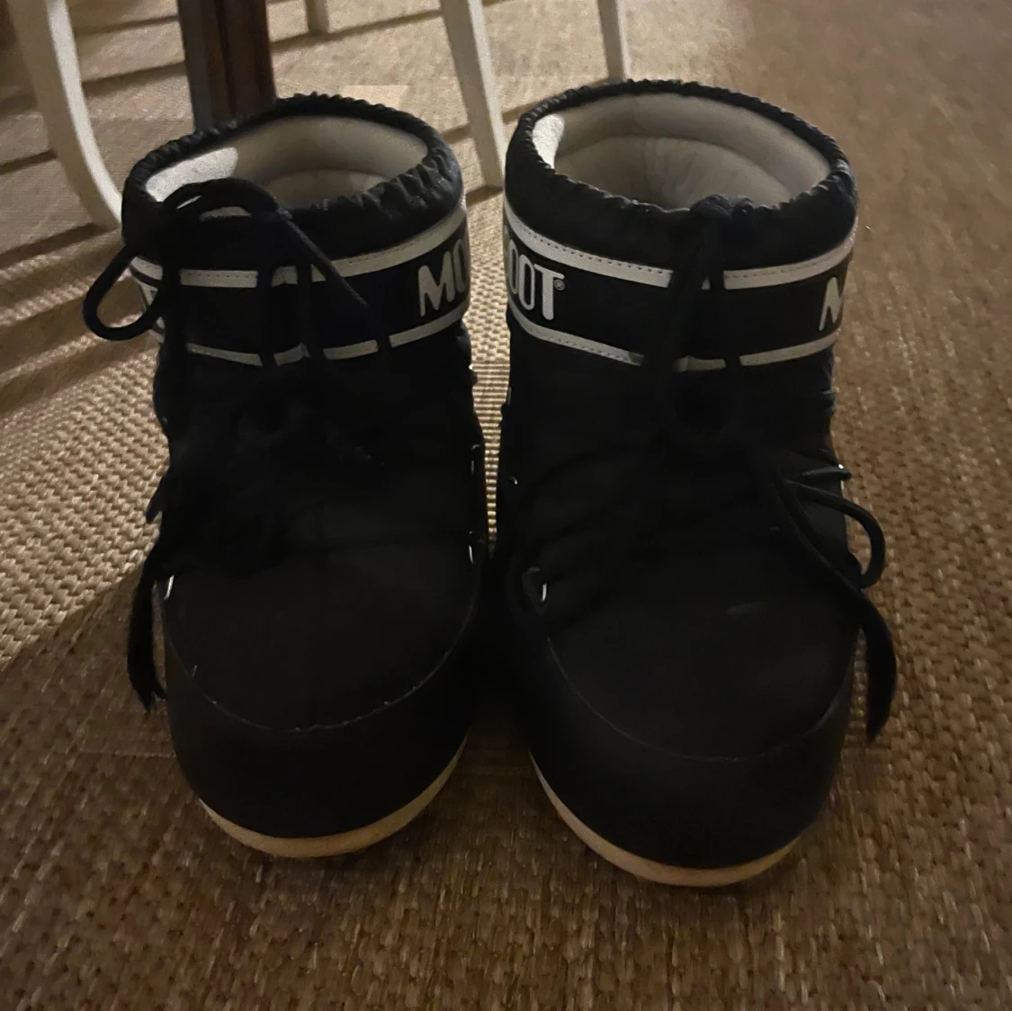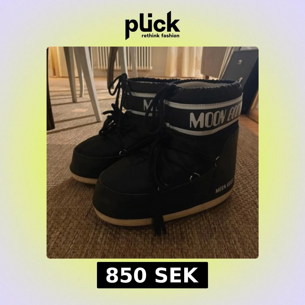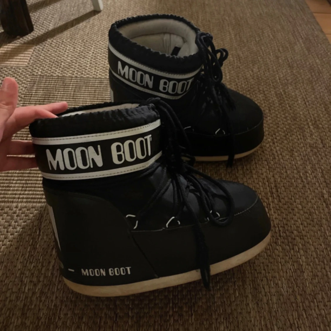 Säljer ett par svarta Moon Boots med vit logga och snörning framtill. I storlek 39/41 passar mig som brukar ha 39, använda en säsong men fortfarande i bra skick