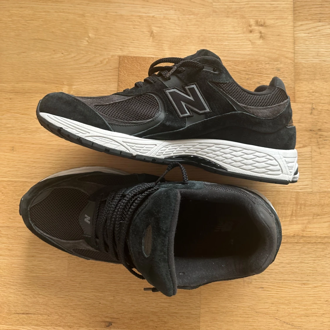 Snygga svarta New Balance sneakers med klassisk N-logga på sidan. Ovandelen är i en mix av mocka och mesh. Skorna har snörning och en vit, mönstrad sula som ger bra grepp. Perfekta för dig som gillar streetwear och sportig vibe. Använda 3 gånger för att det är för små för min fot. Passar även för de som har storlek 47