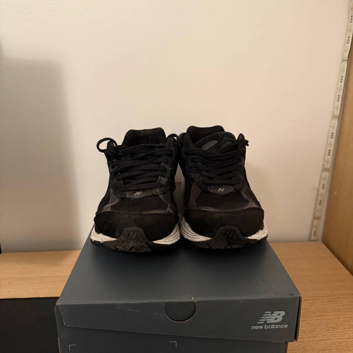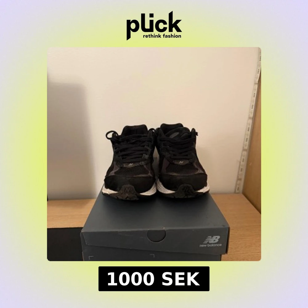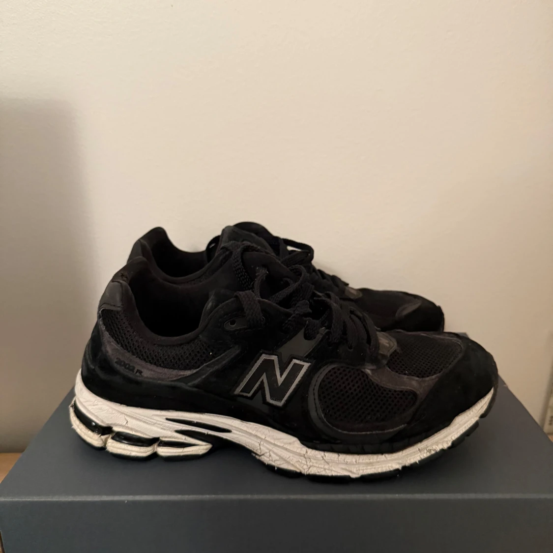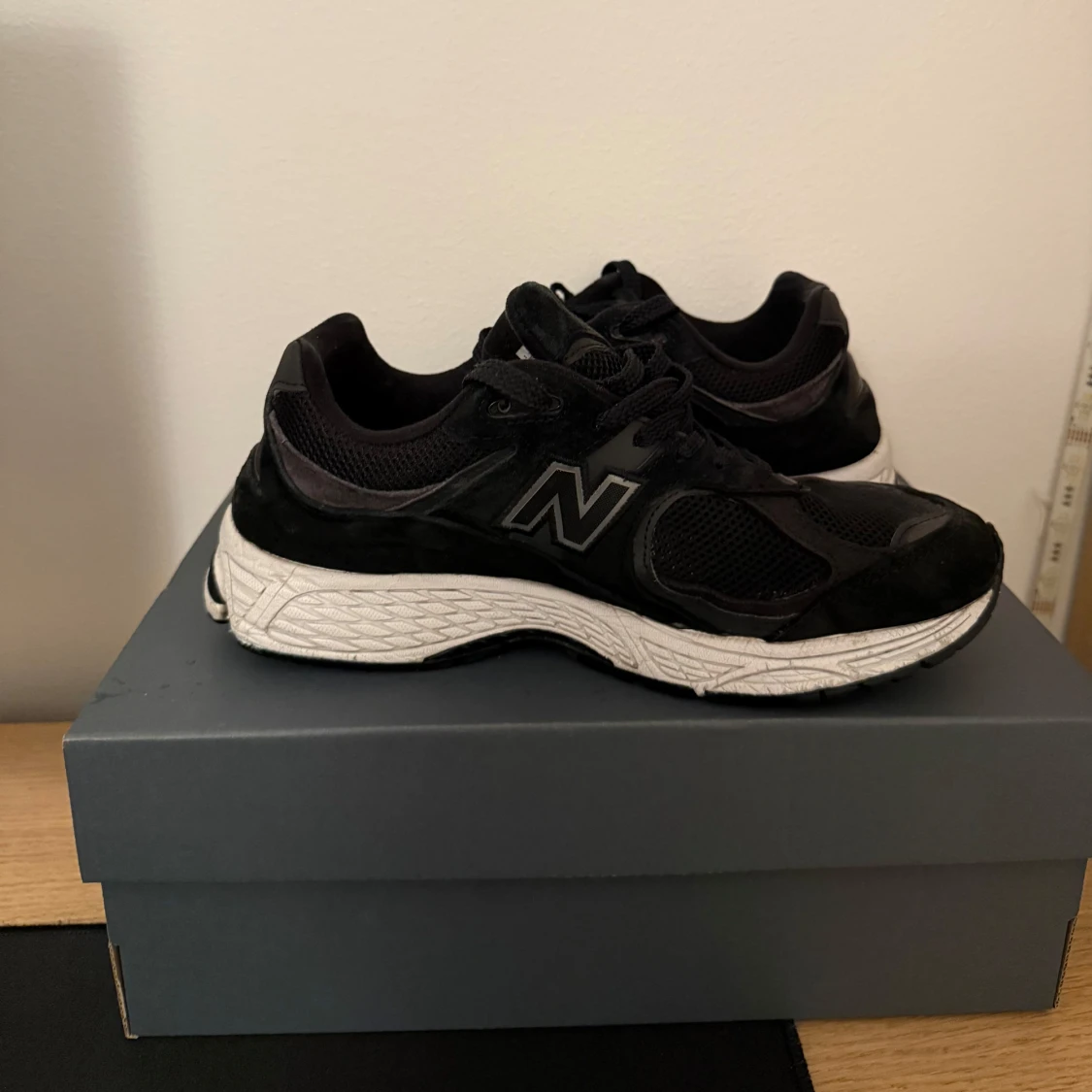 Säljer ett par svarta New Balance 2002R sneakers med vit sula. Skorna har mesh och mockadetaljer, klassisk N-logga på sidan och snörning. Perfekta för dig som gillar stilrena och bekväma sneakers med sportig vibe.