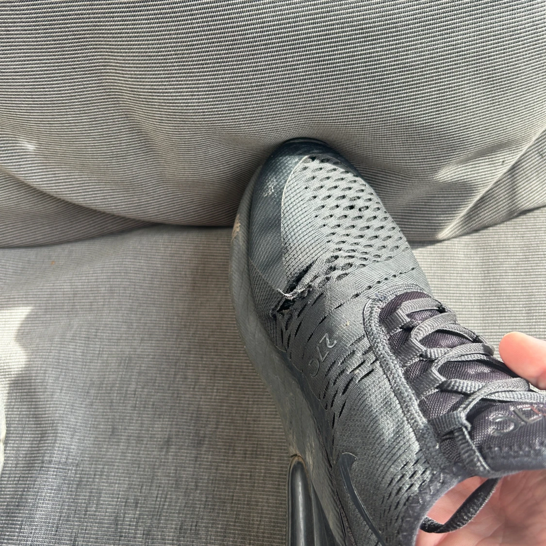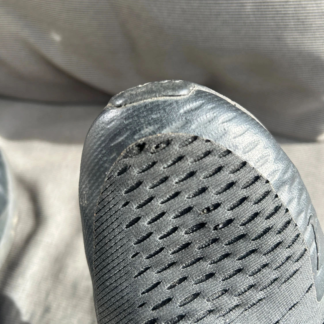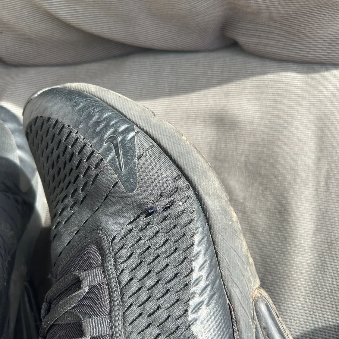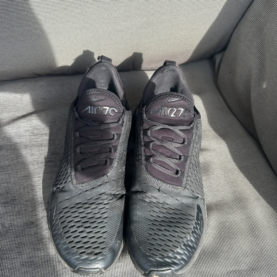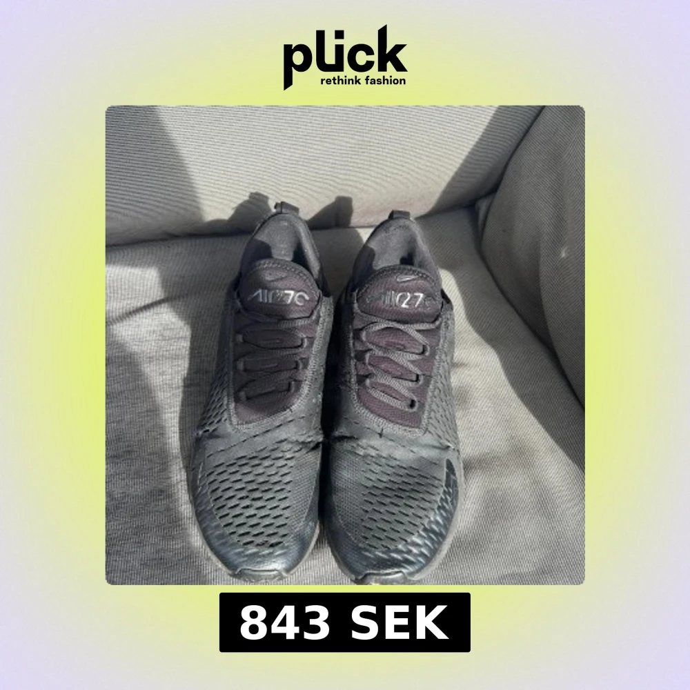 Säljer ett par svarta Nike Air 270 sneakers med ventilerande mesh-ovandel och klassisk snörning. Skorna har en chunky sula och diskreta loggor på tungan och sidan. Perfekta för dig som gillar sportig och stilren look. Lite söndriga på högra skon men inget som man märker av när man har på sig de.