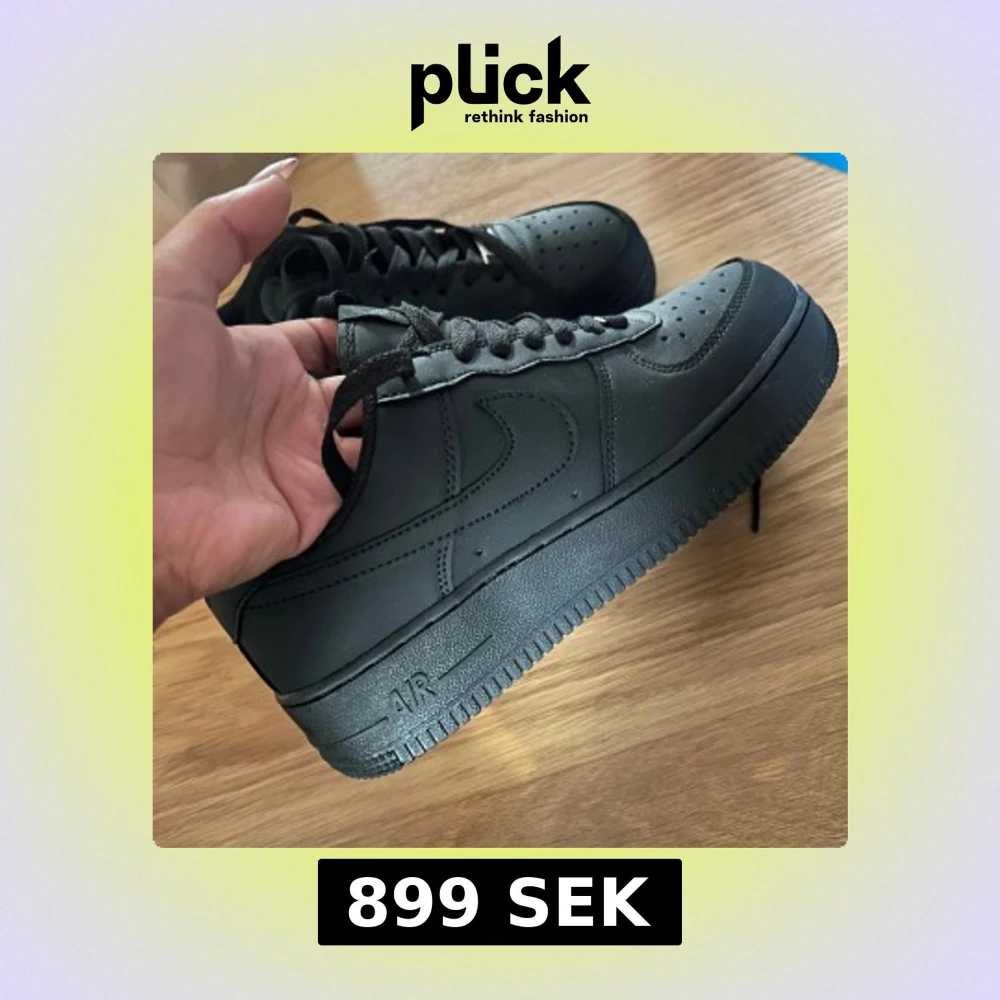 Säljer ett par helsvarta Nike Air Force 1 sneakers med klassisk design. Skorna har snörning, rund tå och är tillverkade i skinn med en platt sula. Perfekta för dig som gillar en clean och tidlös look. Säljes pågrund av fel beställning av storlek.