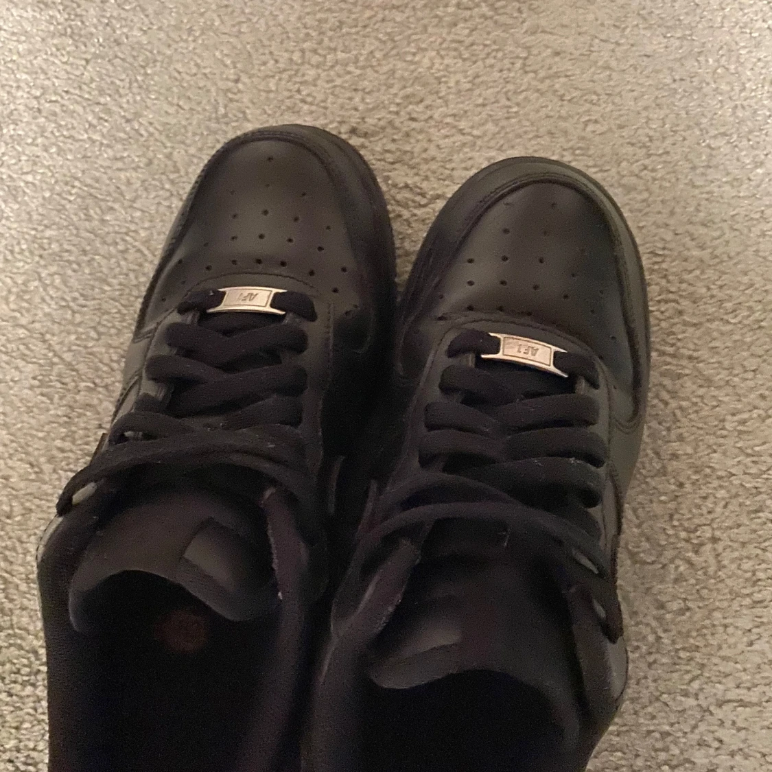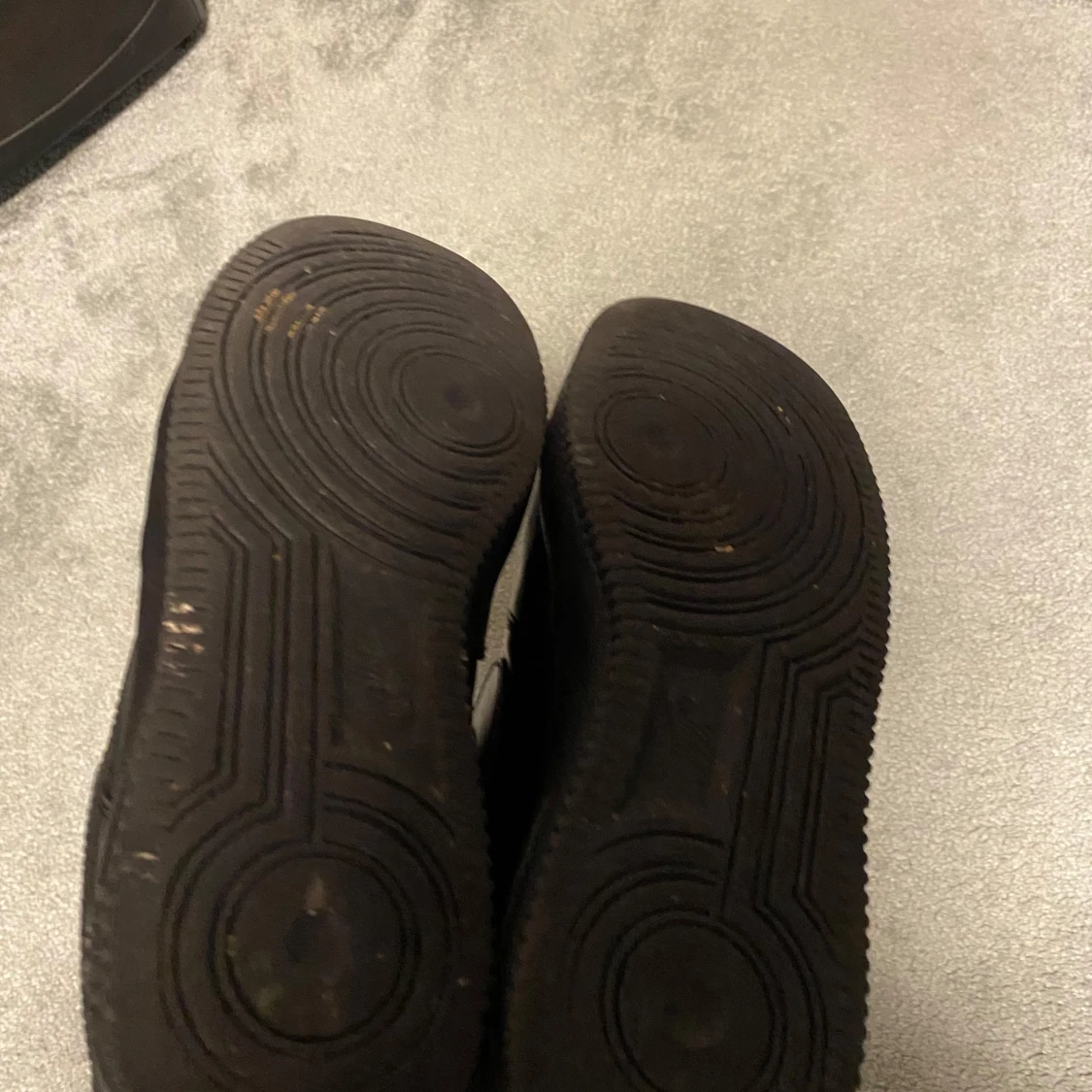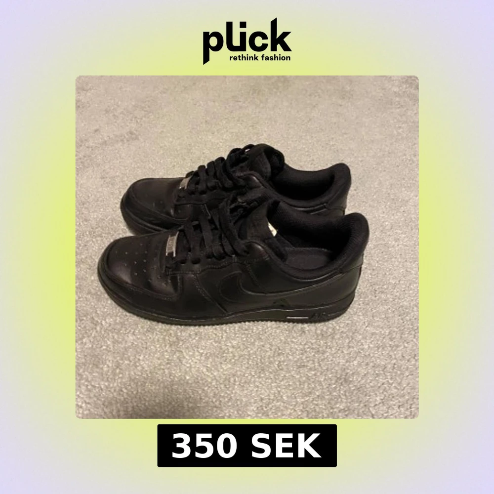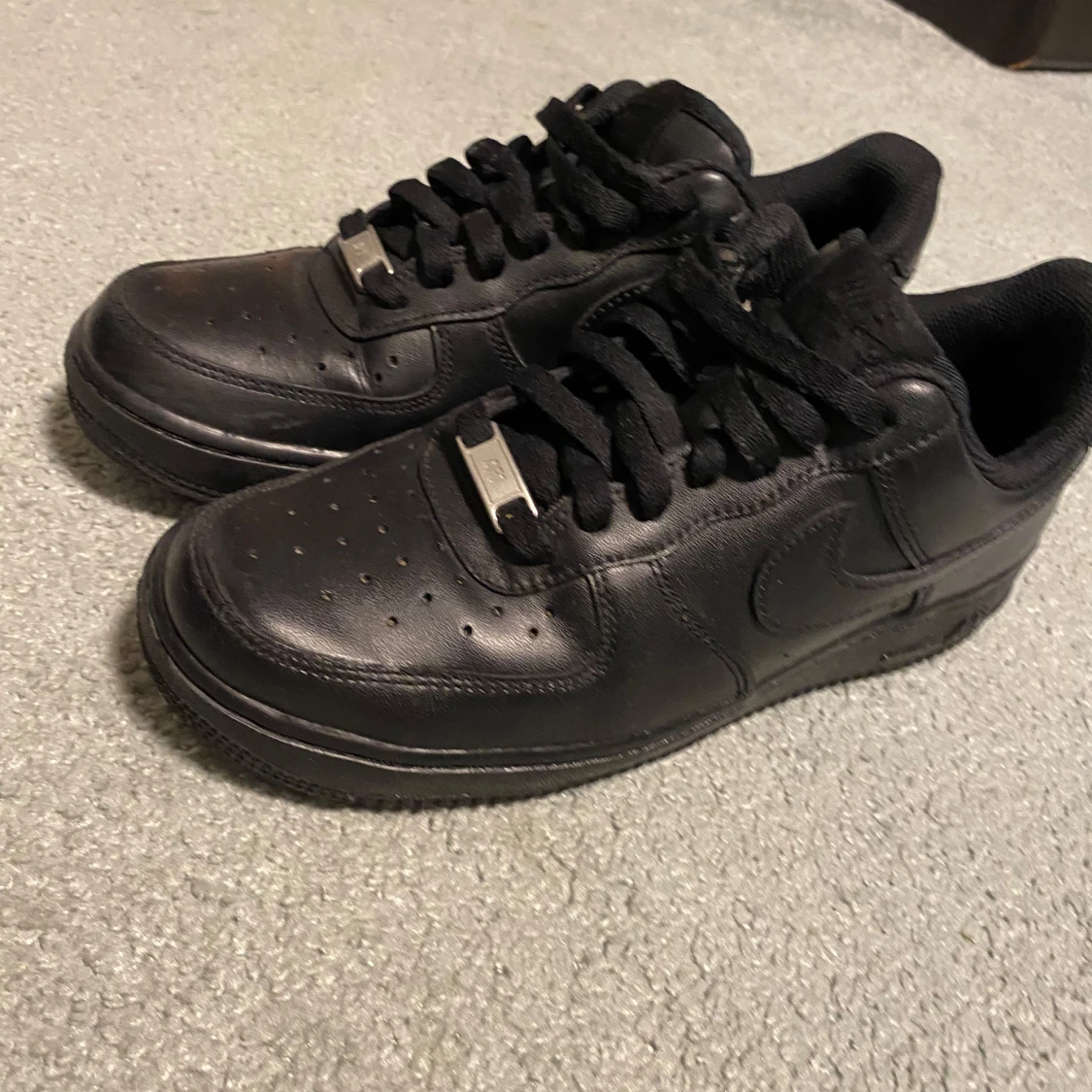 Säljer ett par helsvarta Nike Air Force 1 sneakers med klassisk design. Skorna har snörning, rund tå och platt sula. Tillverkade i skinn med diskret Nike-logga på sidan och metallbricka på snörena. Perfekta för en stilren och clean look.