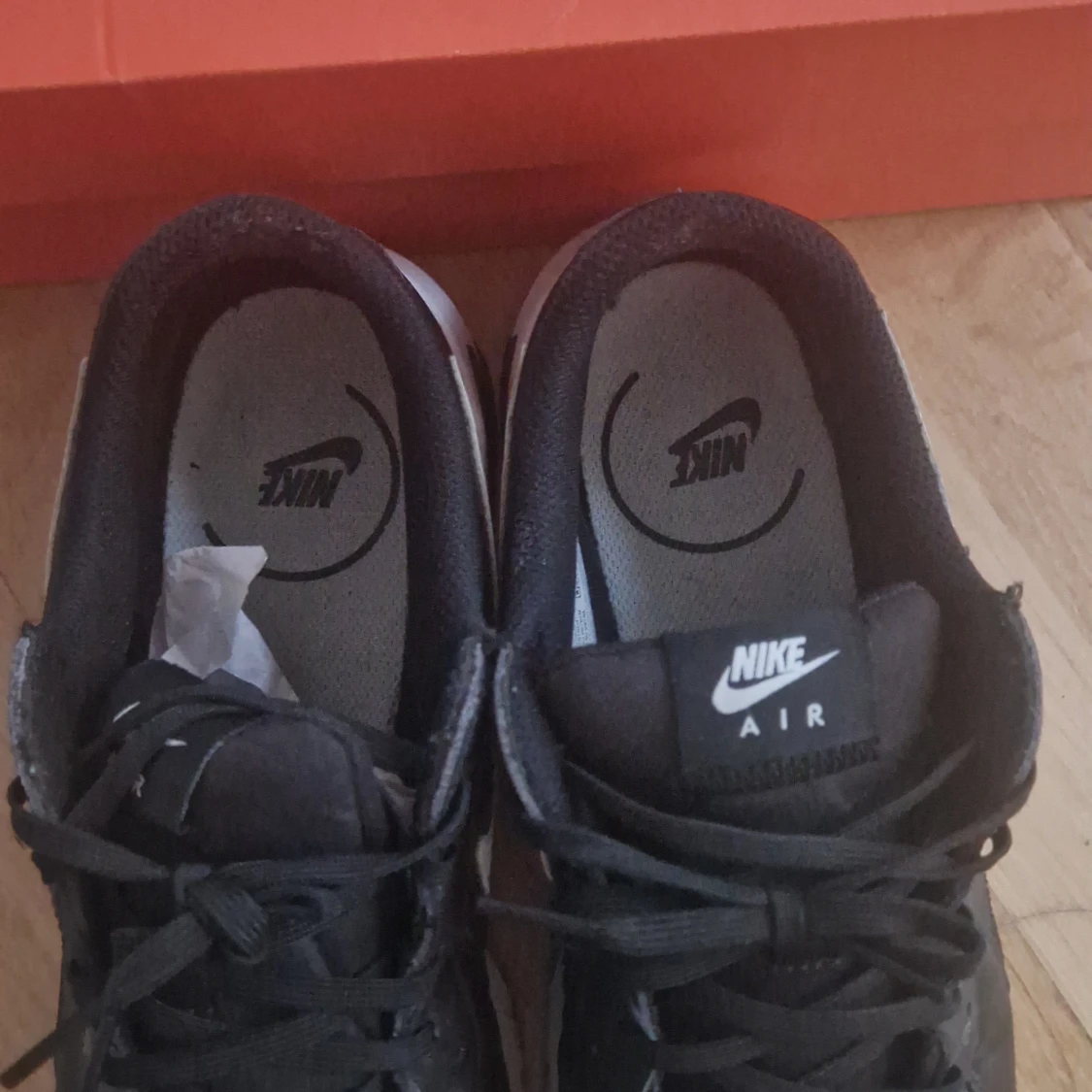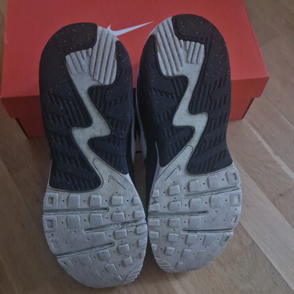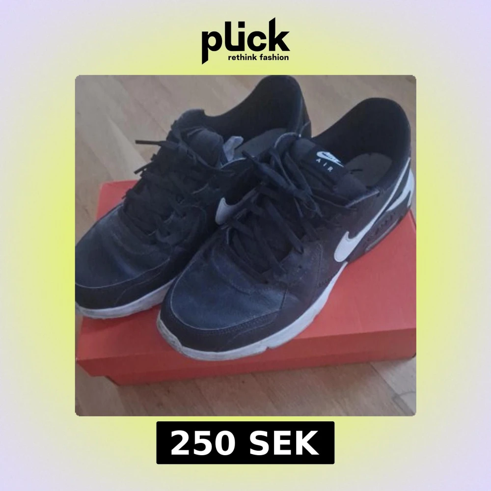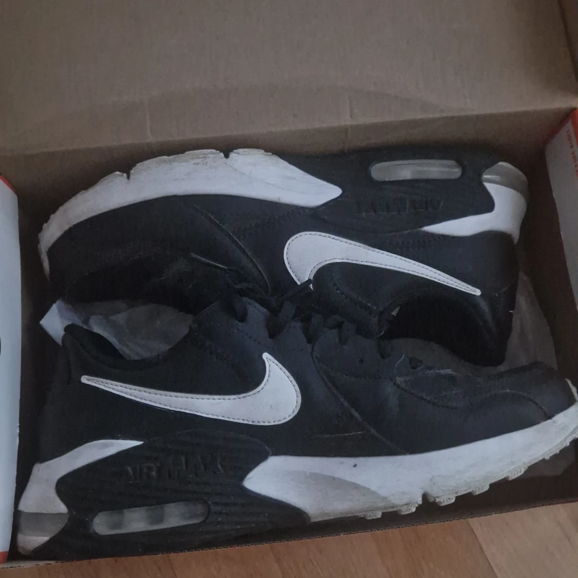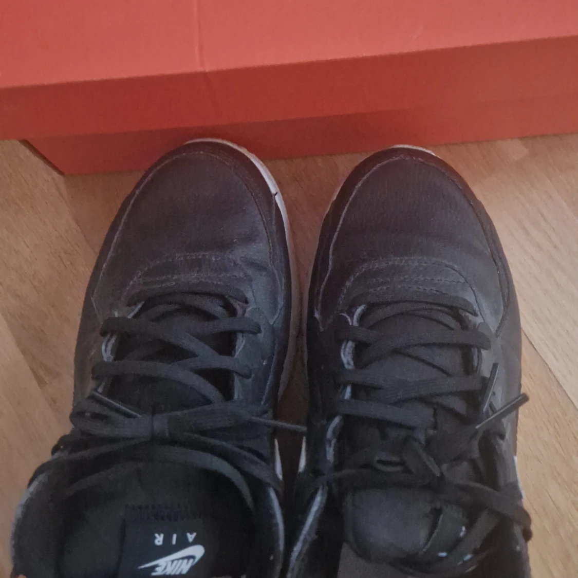 Säljer ett par svarta Nike Air Max sneakers med vit sula och klassisk swoosh på sidan. Skorna har snörning och en rund tå, samt synlig Air-dämpning i sulan. Materialet är en mix av syntet och skinn, vilket ger en sportig och clean look. Perfekta för dig som gillar streetstyle.