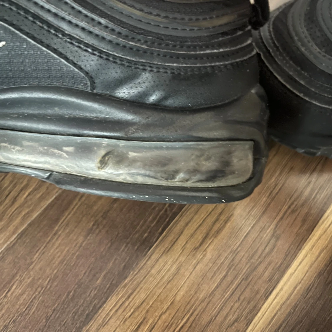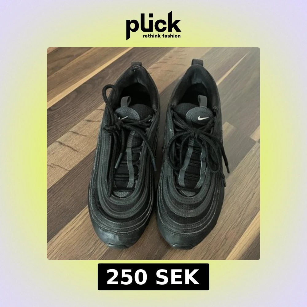 Säljer ett par svarta Nike Air Max sneakers med klassisk vågig design och synlig luftbubbla i sulan. Skorna har snörning, rund tå och är tillverkade i en mix av syntet och textil. Perfekta för dig som gillar sportig och stilren look.