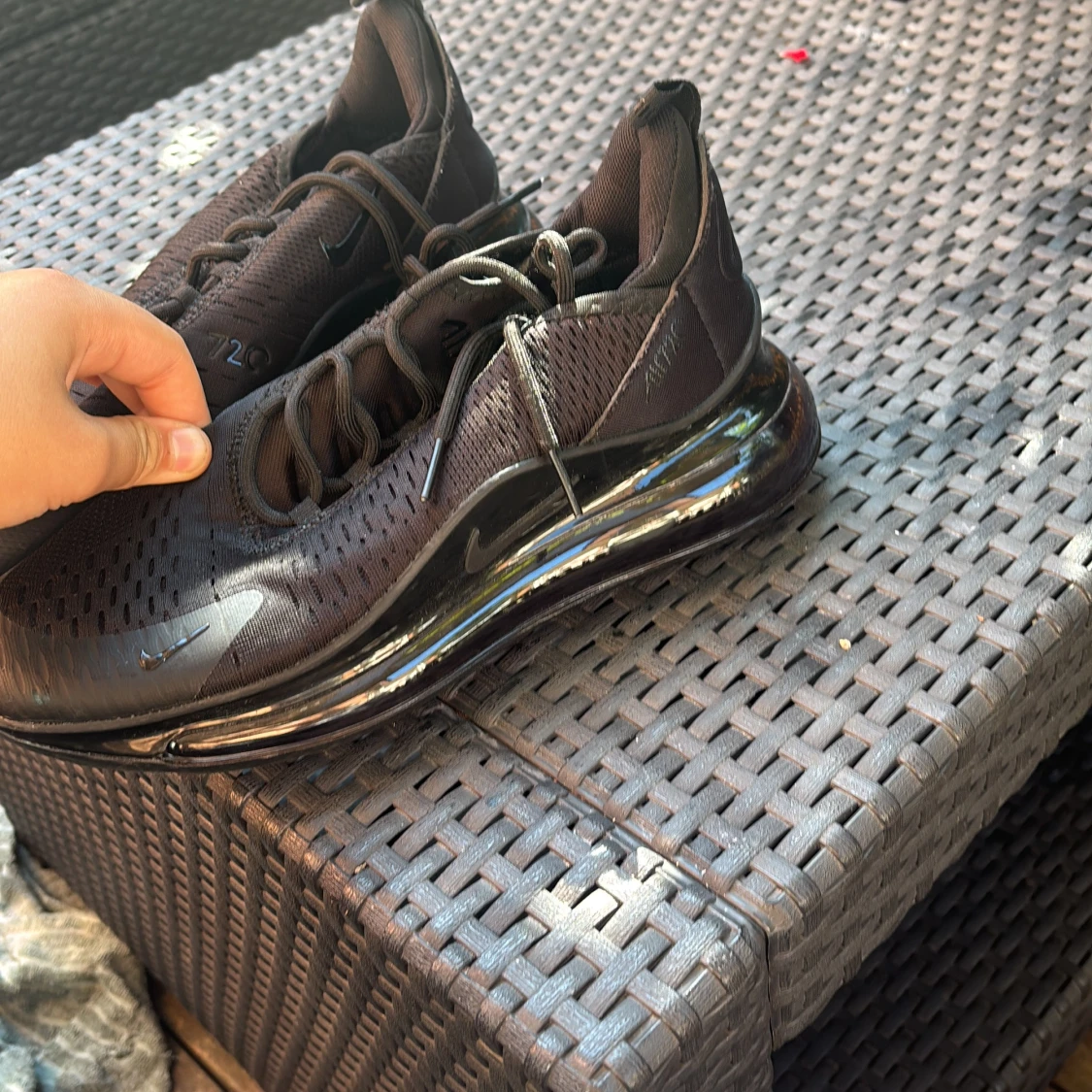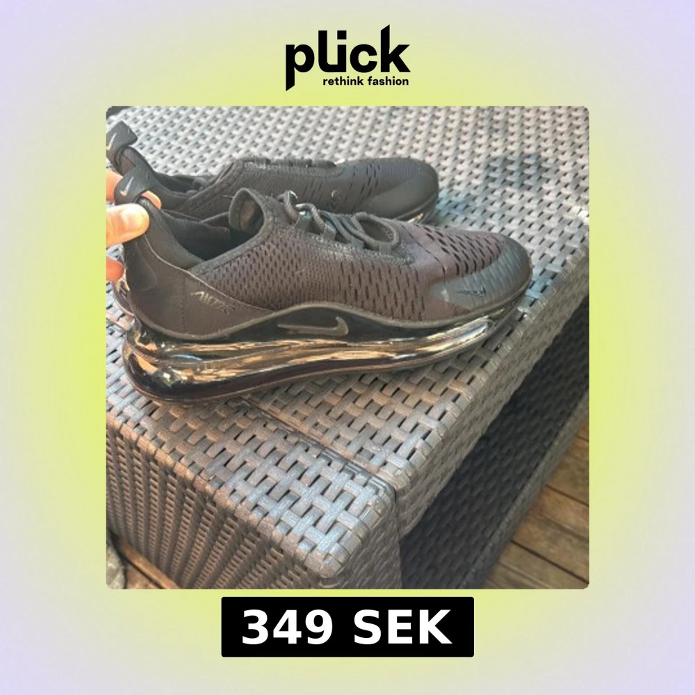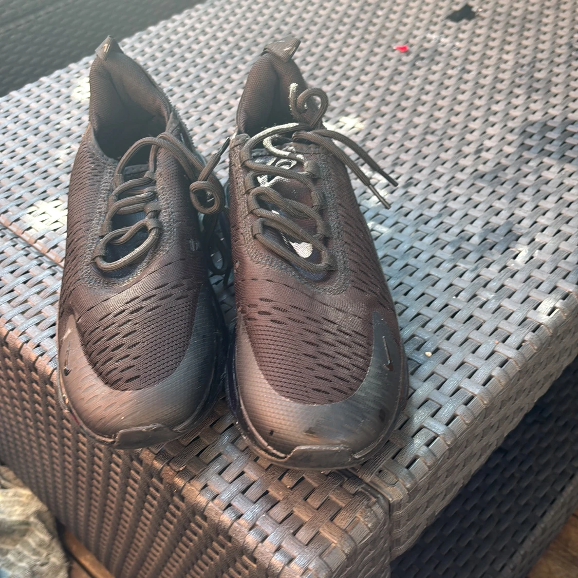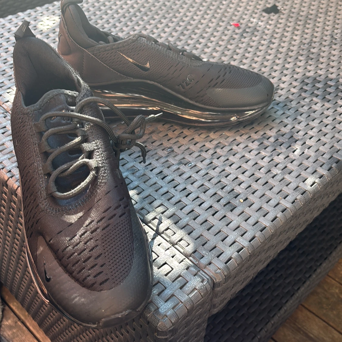 Säljer ett par helsvarta Nike Air Max sneakers med mesh-ovandel och synlig luftsula. Skorna har snörning och en sportig vibe, perfekt för dig som gillar streetwear. Snygg design med diskreta detaljer och bekväm passform.