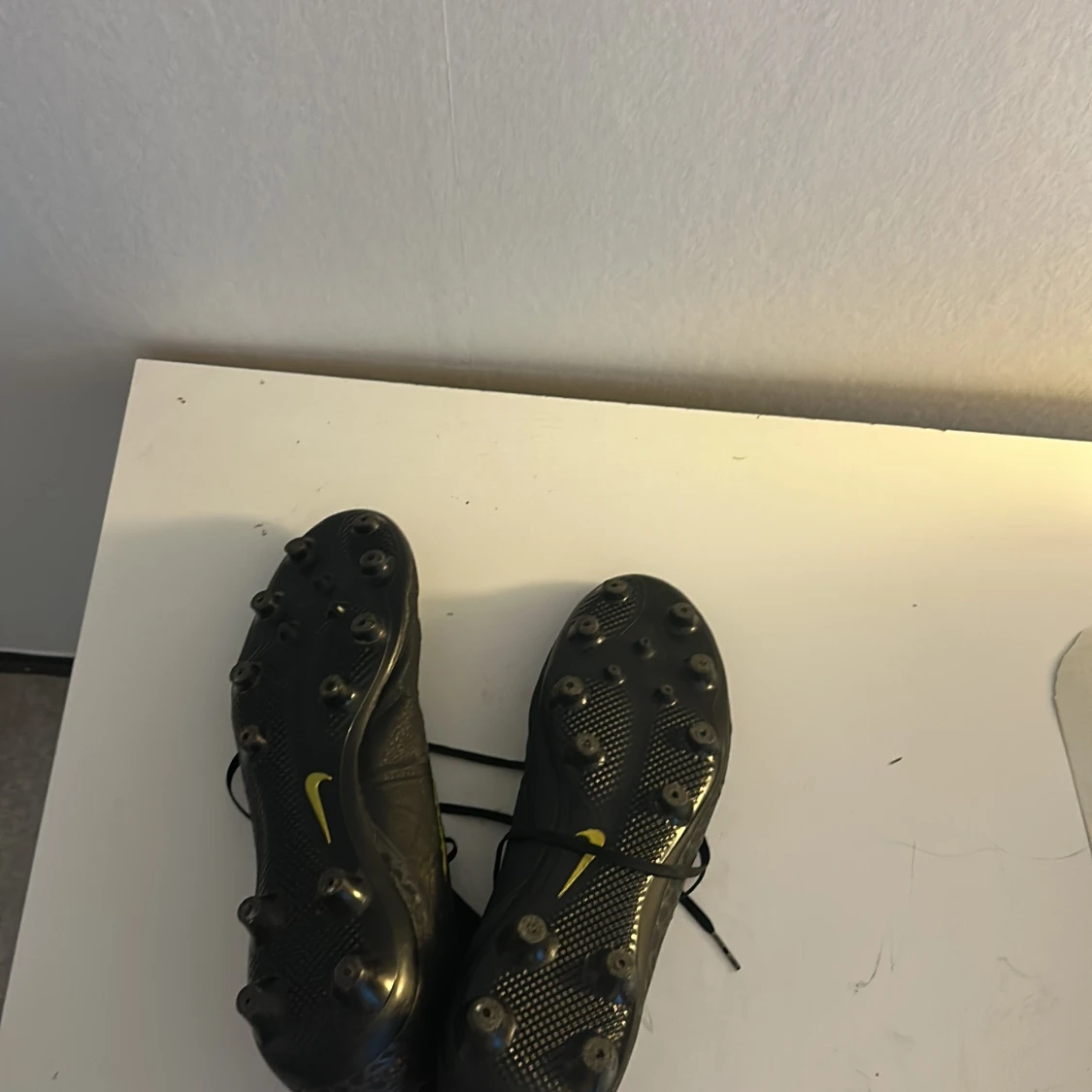 Svarta Nike fotbollsskor med gula detaljer