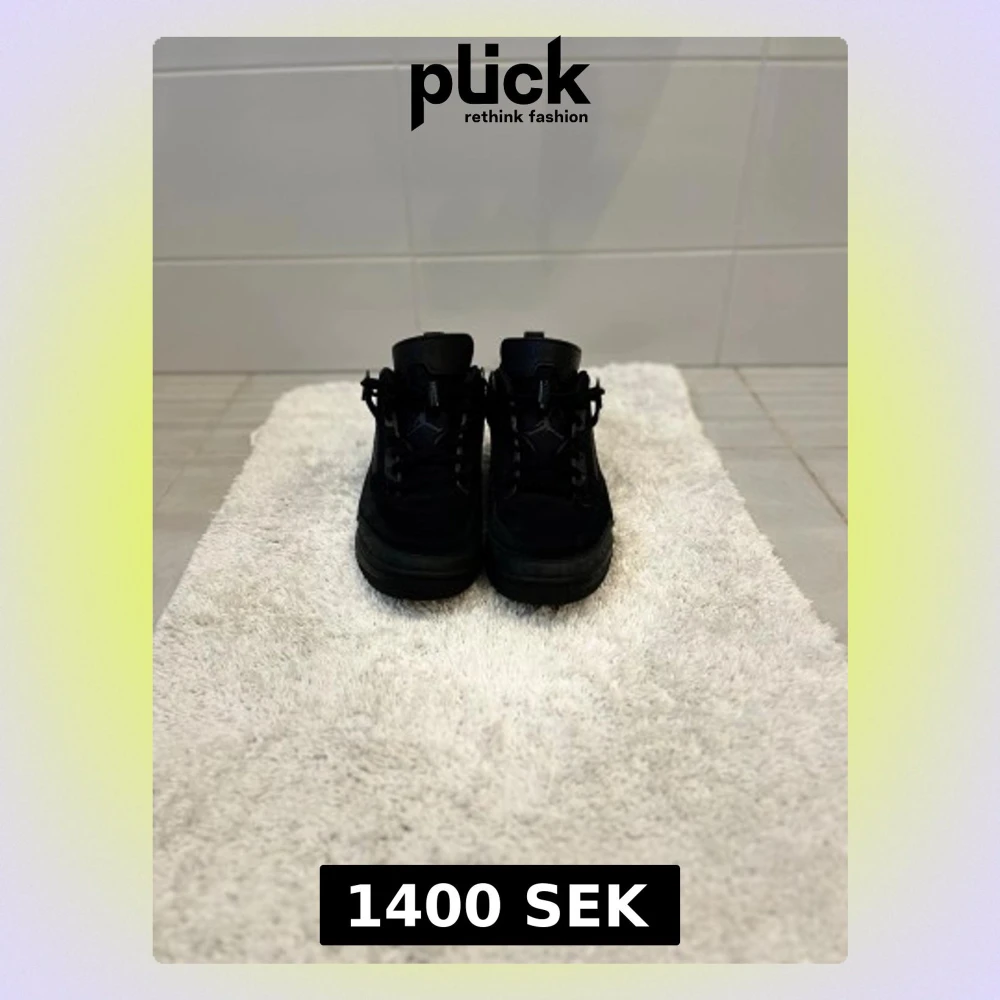 Säljer ett par helsvarta Nike Jordan 4 sneakers med snygga detaljer och meshpaneler på sidorna. Skorna har snörning, platt sula och rund tå. Materialet är en mix av mocka och syntet, vilket ger en cool och sportig vibe. Perfekt för dig som gillar streetwear och vill sticka ut.