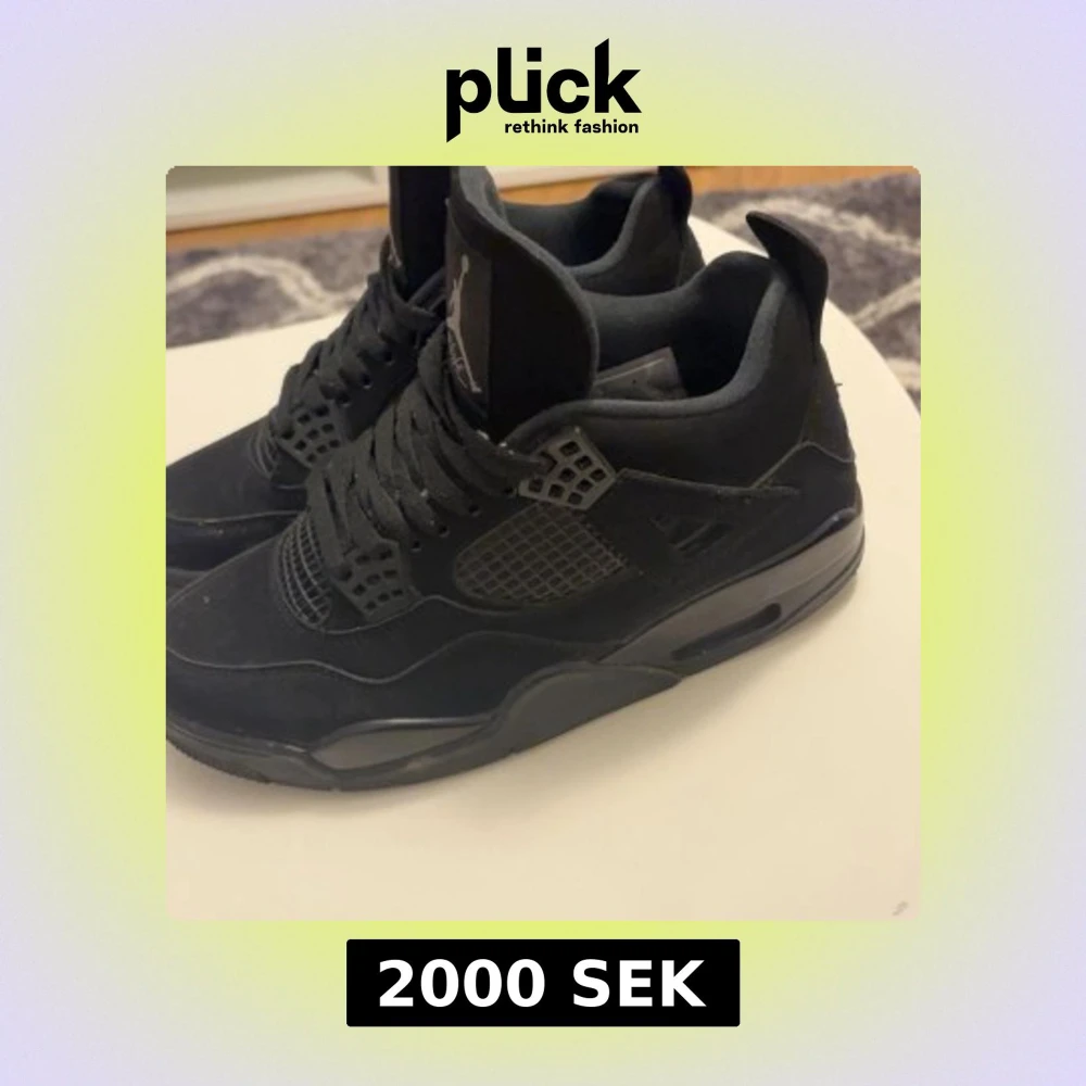 Säljer ett par svarta Nike Jordan 4 sneakers black cat. Köpta för ungefär 2 år sen har tyvärr inte kvitto kvar men de är använda i bra skick är lite smutsiga men går att rengöra