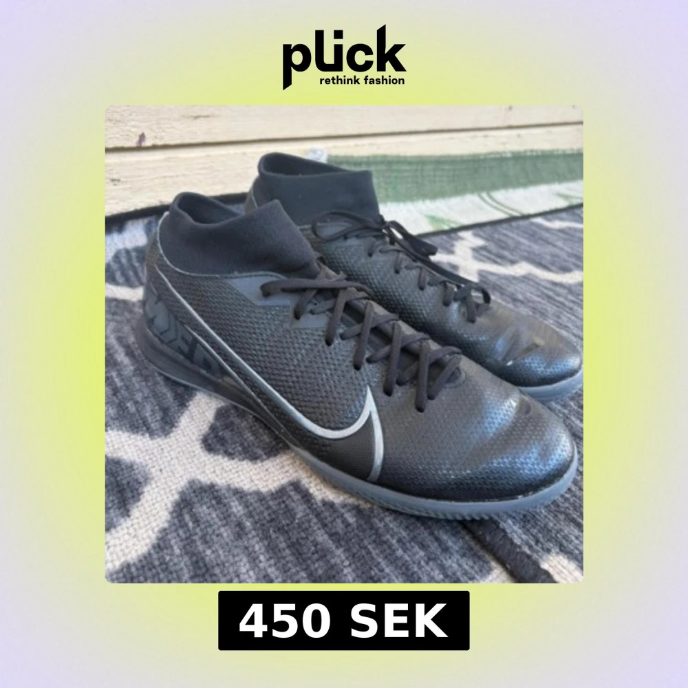 Snygga svarta Nike Mercurial fotbollsskor med högt skaft och snörning. Skorna har en strumpliknande passform och är tillverkade i syntetmaterial med en platt, mönstrad sula för bra grepp på inomhusplan. Perfekta för dig som vill ha stilrena och sportiga skor på planen.