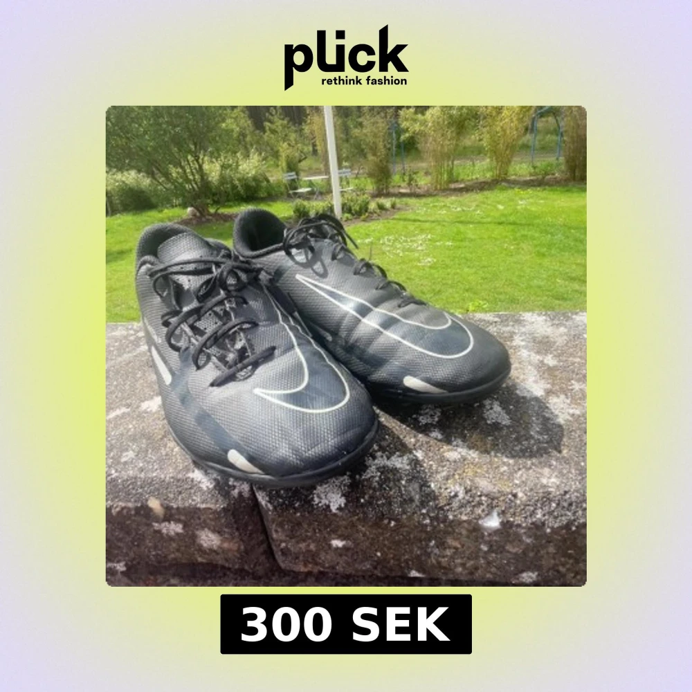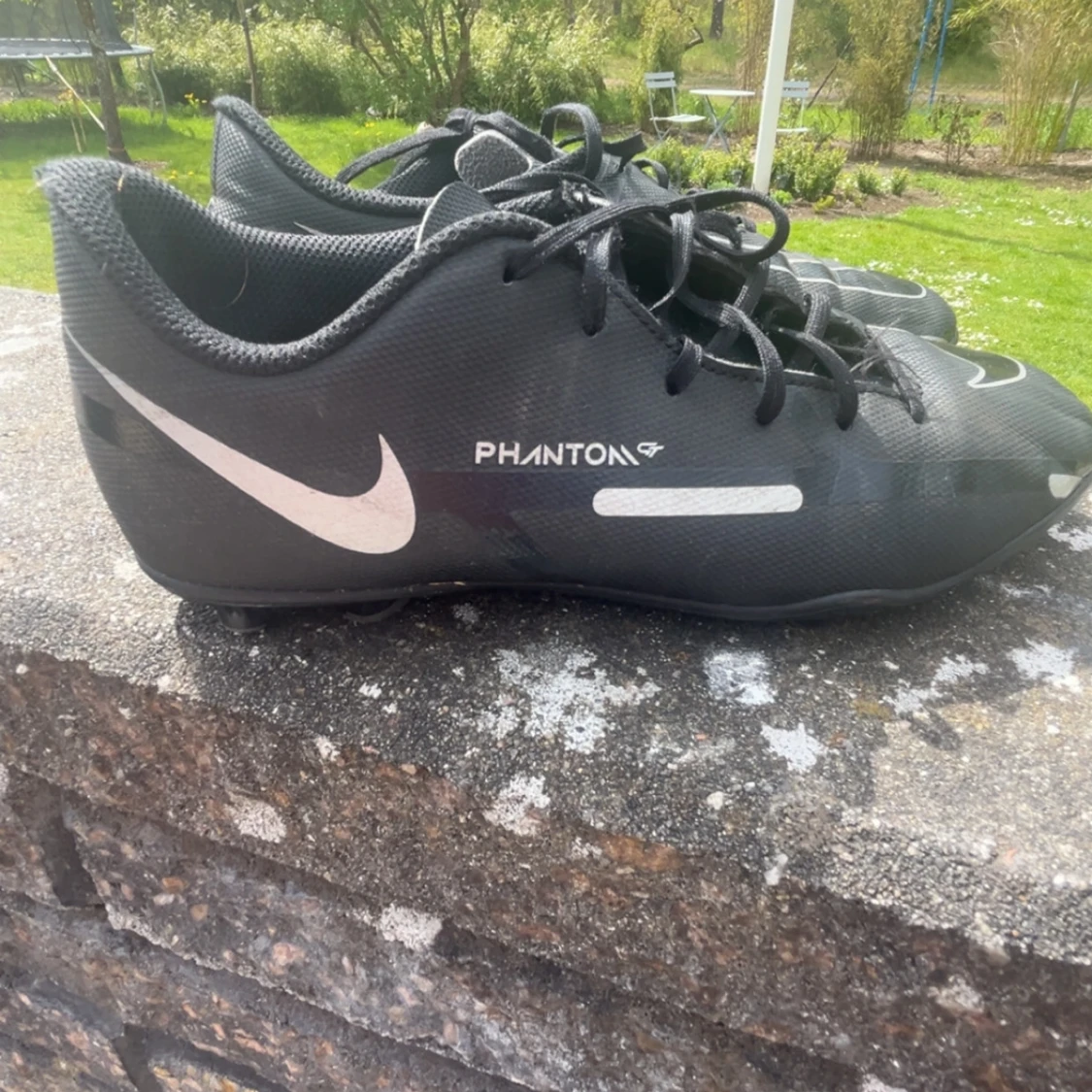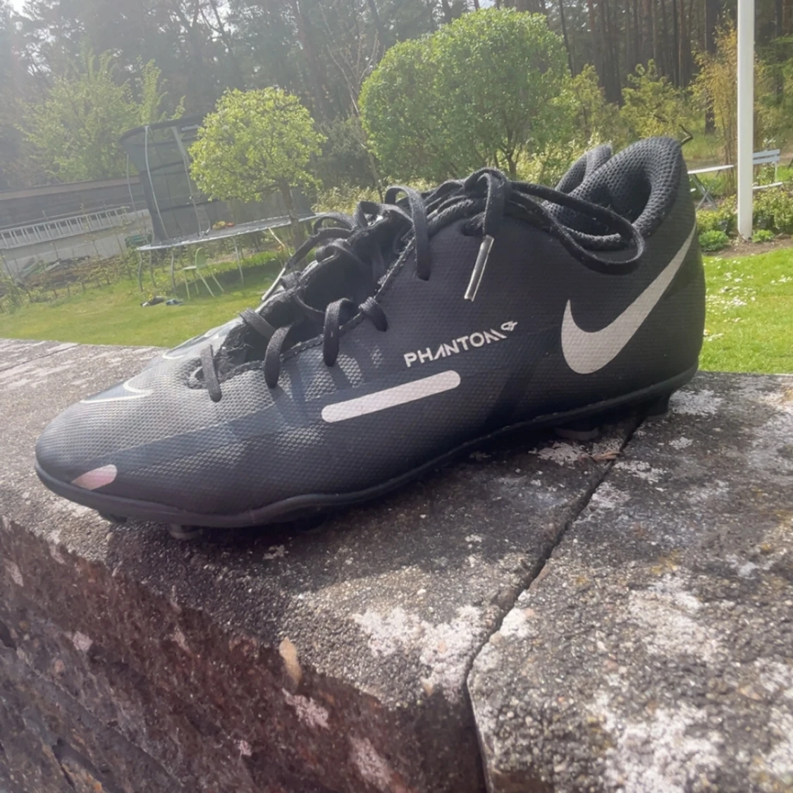 Säljer ett par svarta Nike Phantom fotbollsskor med vita detaljer och snörning. Skorna har en låg profil och är designade för bra grepp på planen. Perfekta för dig som vill ha stilrena och funktionella skor till fotbollsträningen. 💓