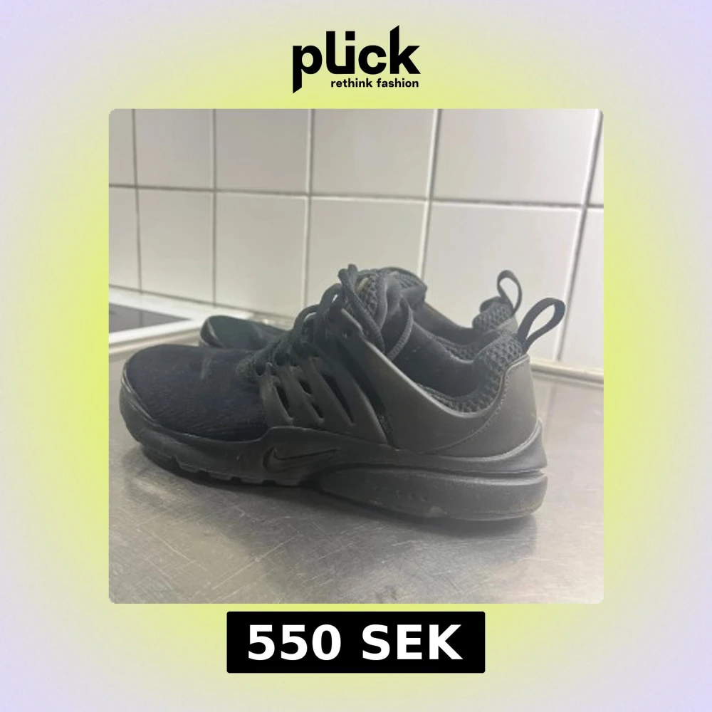 Säljer ett par helsvarta Nike Presto sneakers med mesh-ovandel och syntetiska detaljer. Skorna har snörning, rund tå och en flexibel sula för extra komfort. Perfekta för dig som gillar en clean och sportig look. Behövs tvättas så då de legat i garderoben
