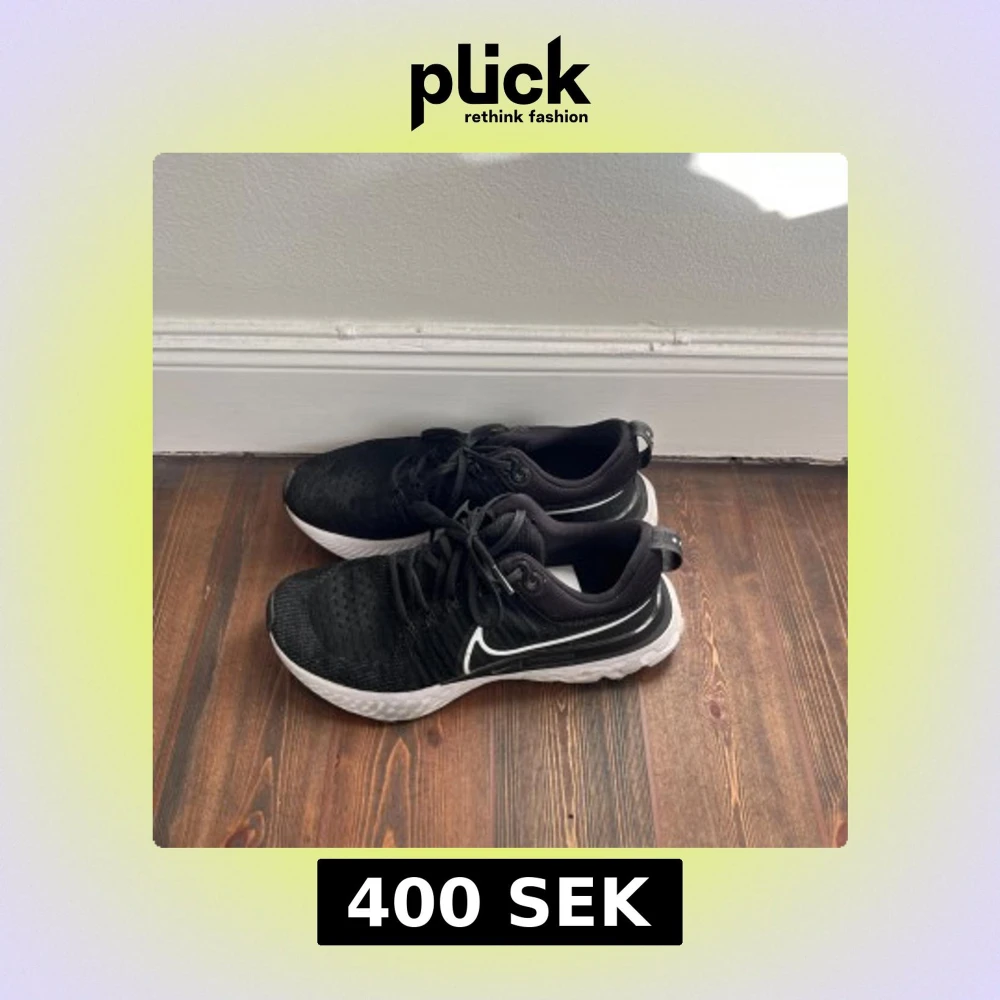 Säljer ett par svarta Nike React sneakers med vit sula och klassisk Nike-logga i vitt. Skorna har snörning och är tillverkade i syntetmaterial för en bekväm passform. Perfekta för träning eller vardagsbruk.