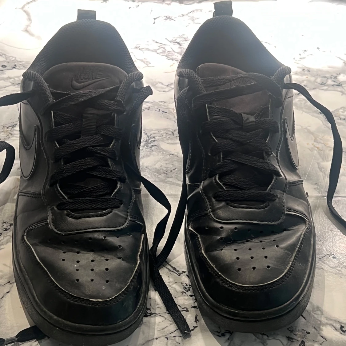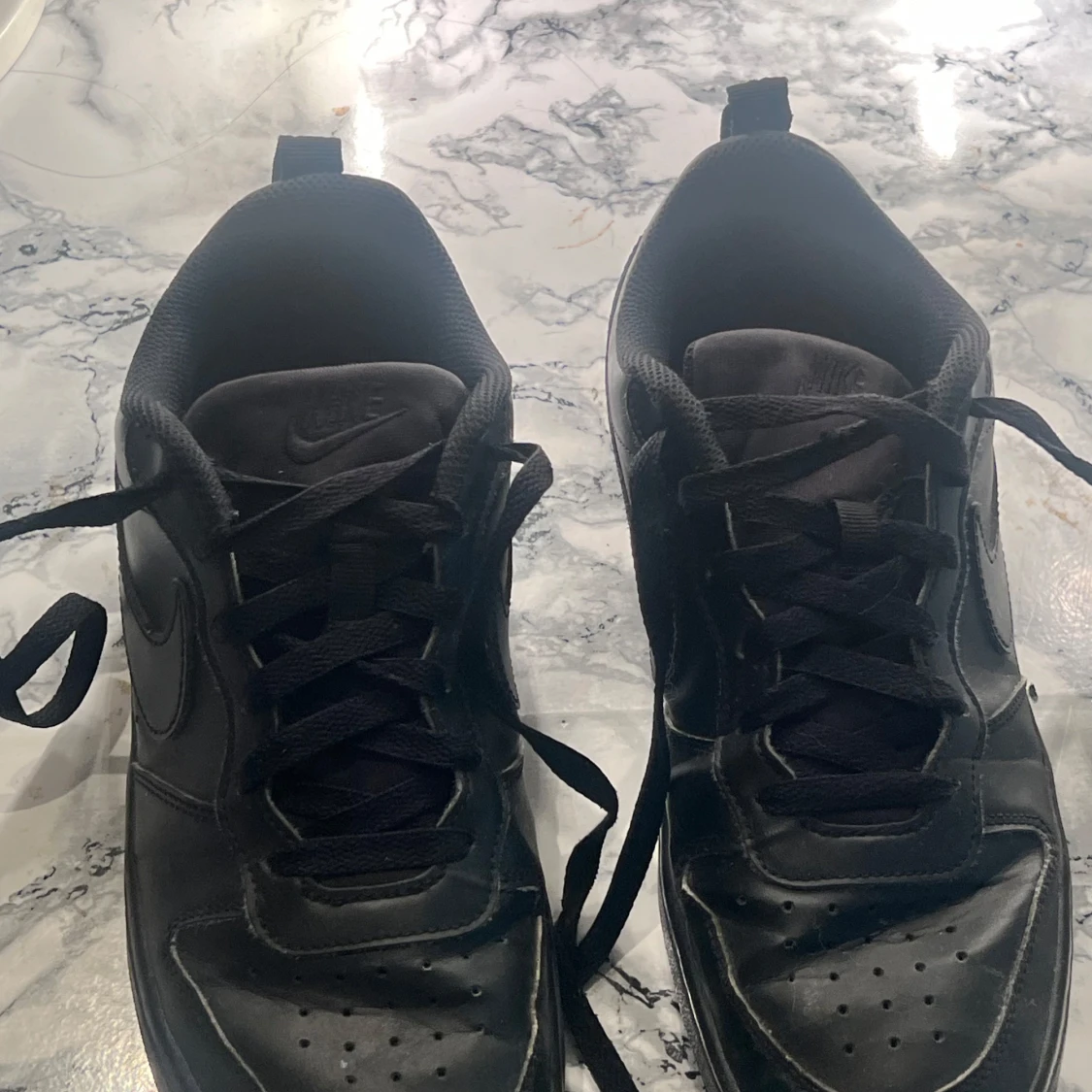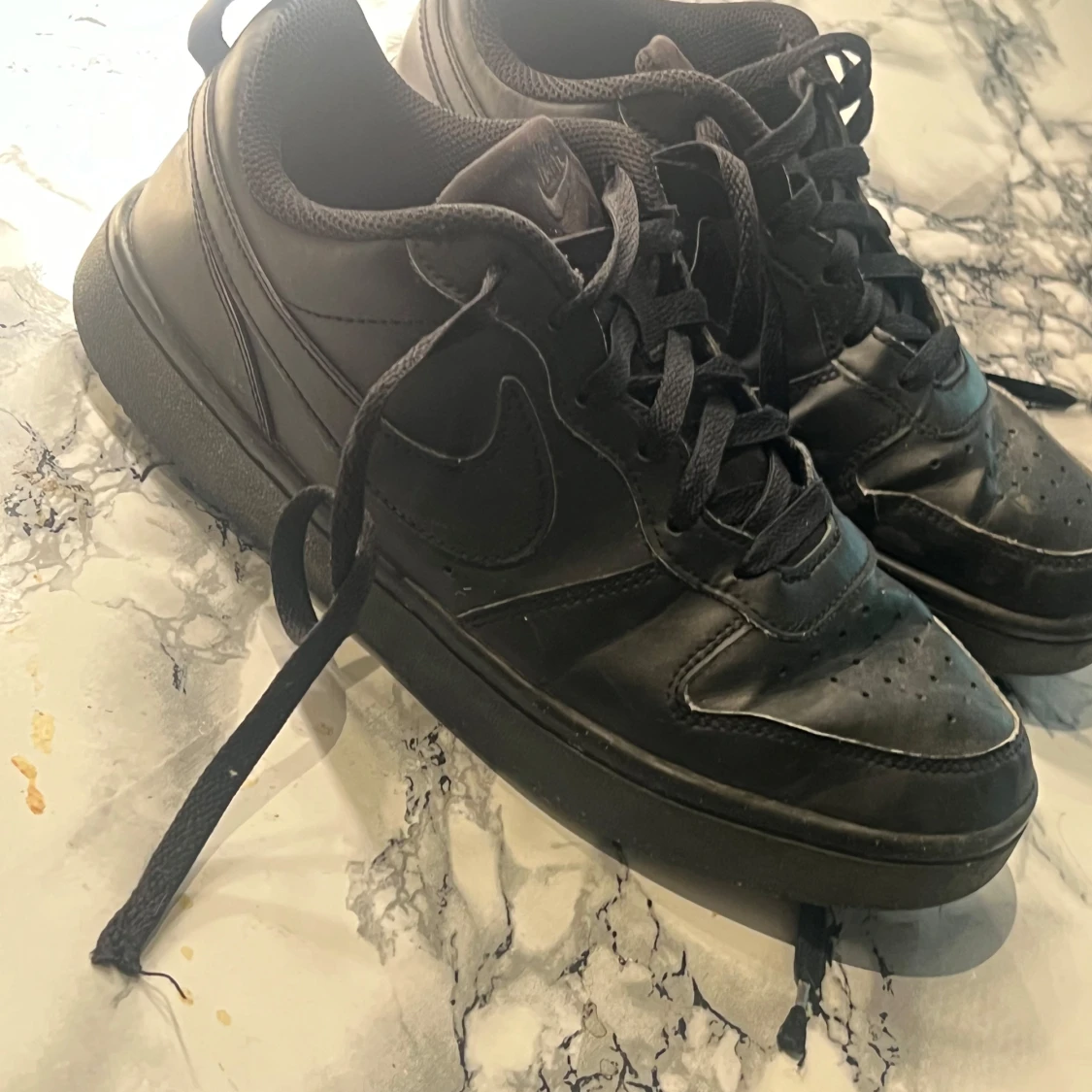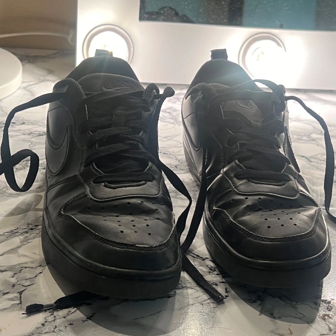 Klassiska helsvarta Nike sneakers med rund tå och snörning. Skorna har en platt sula och är tillverkade i skinn med diskreta perforeringar på tån för ventilation. Perfekta för en stilren och sportig look.