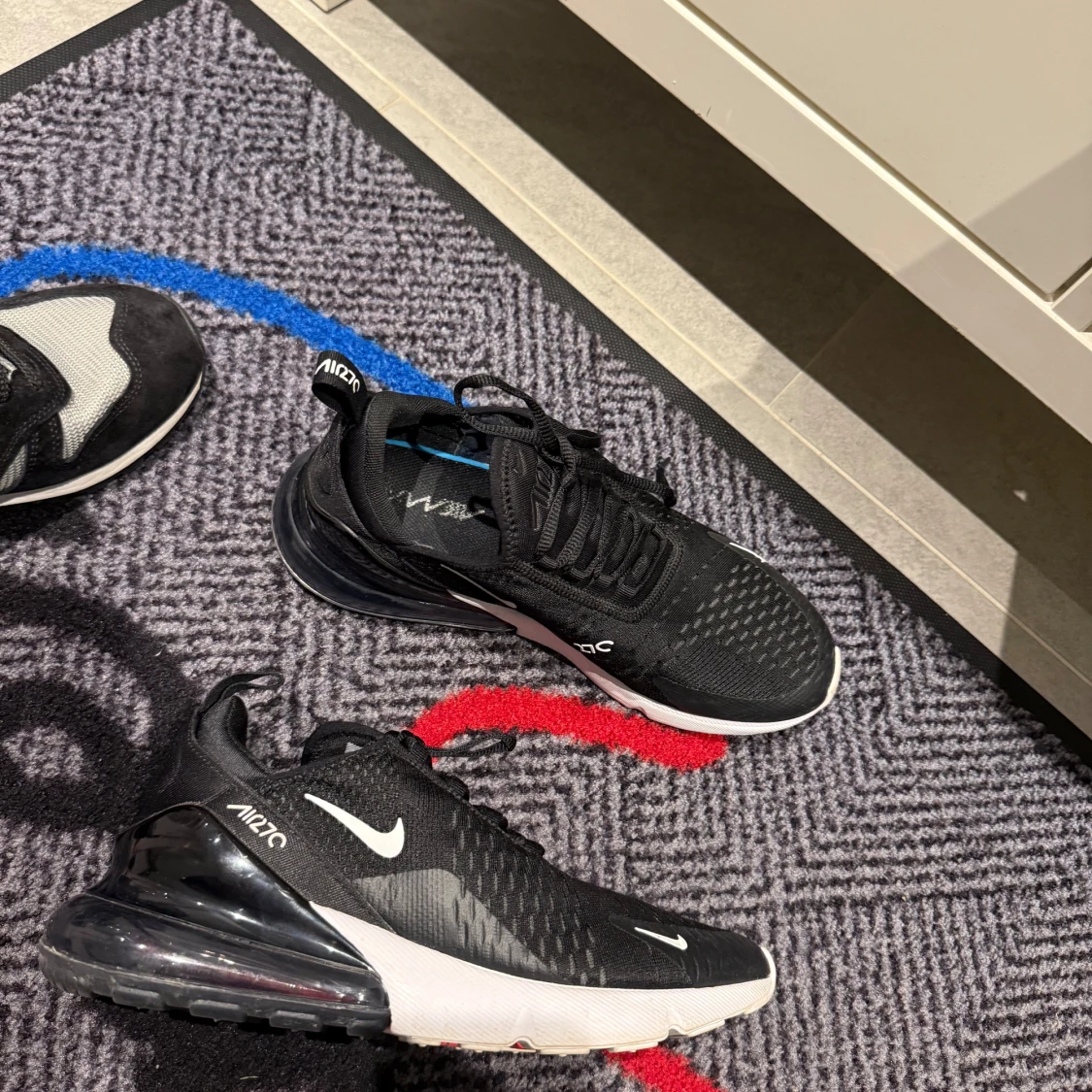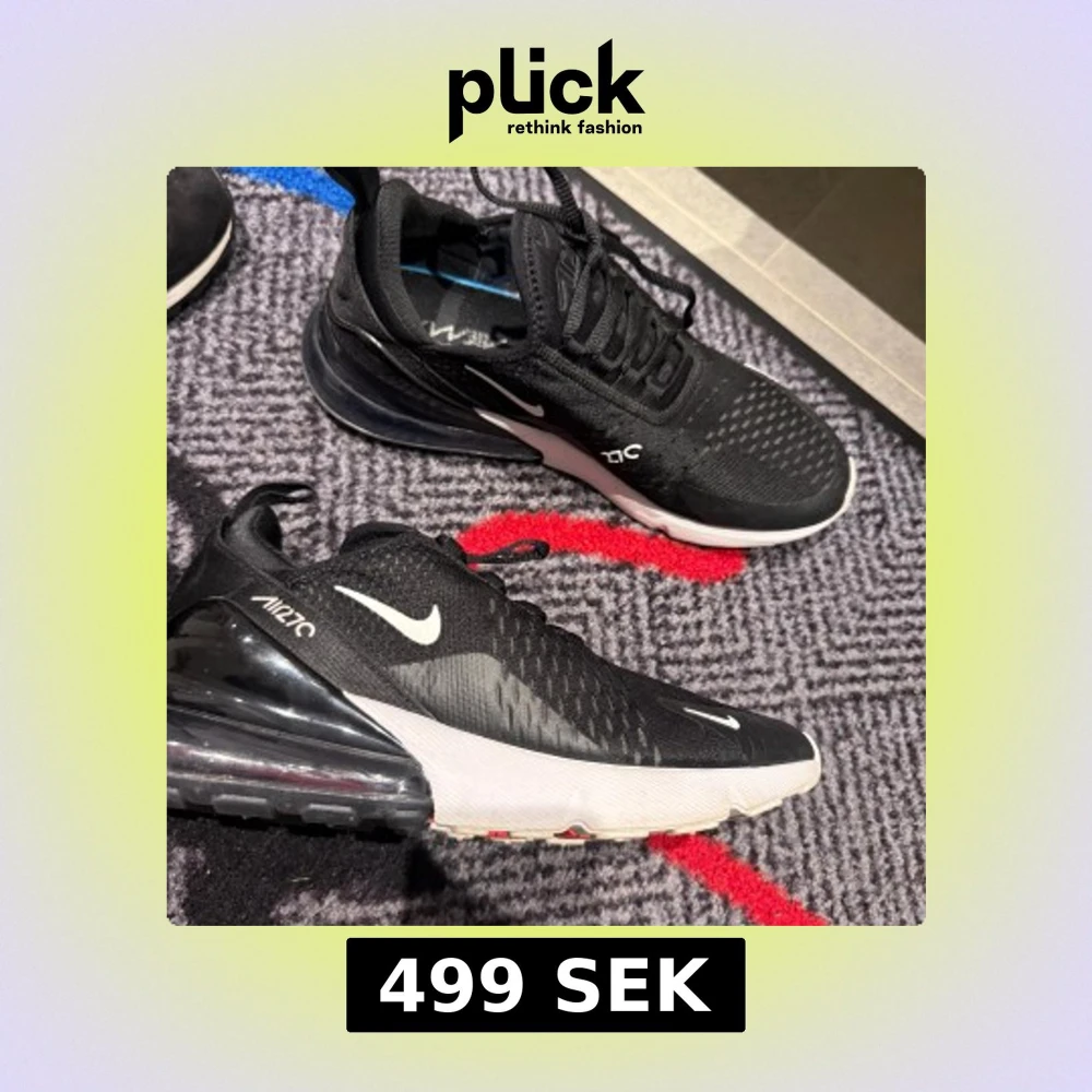 Snygga svarta Nike sneakers med vit sula och synlig Air-dämpning i hälen. Skorna har en modern design med snörning och små vita detaljer. Perfekta för en sportig look. Använda 3-4 gånger