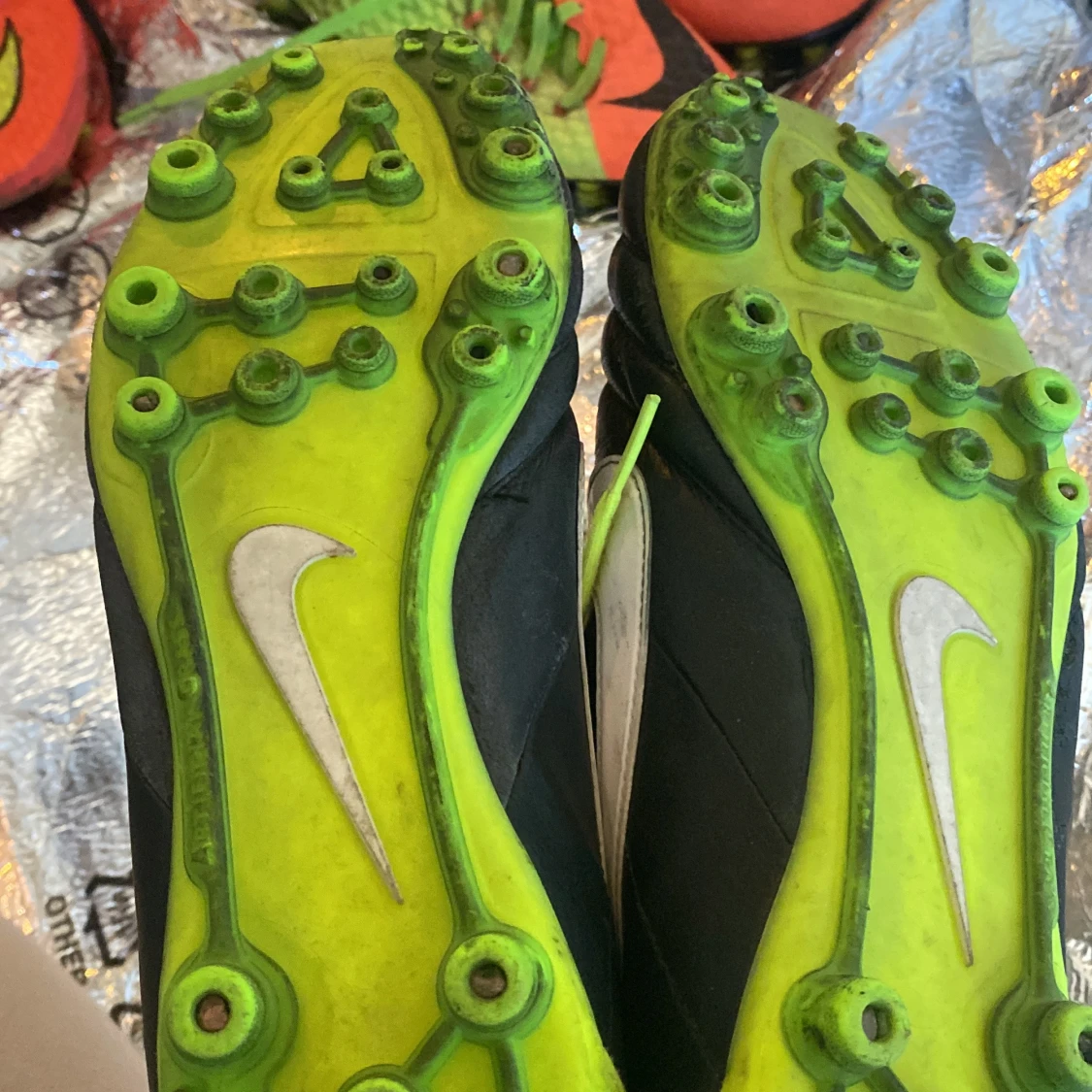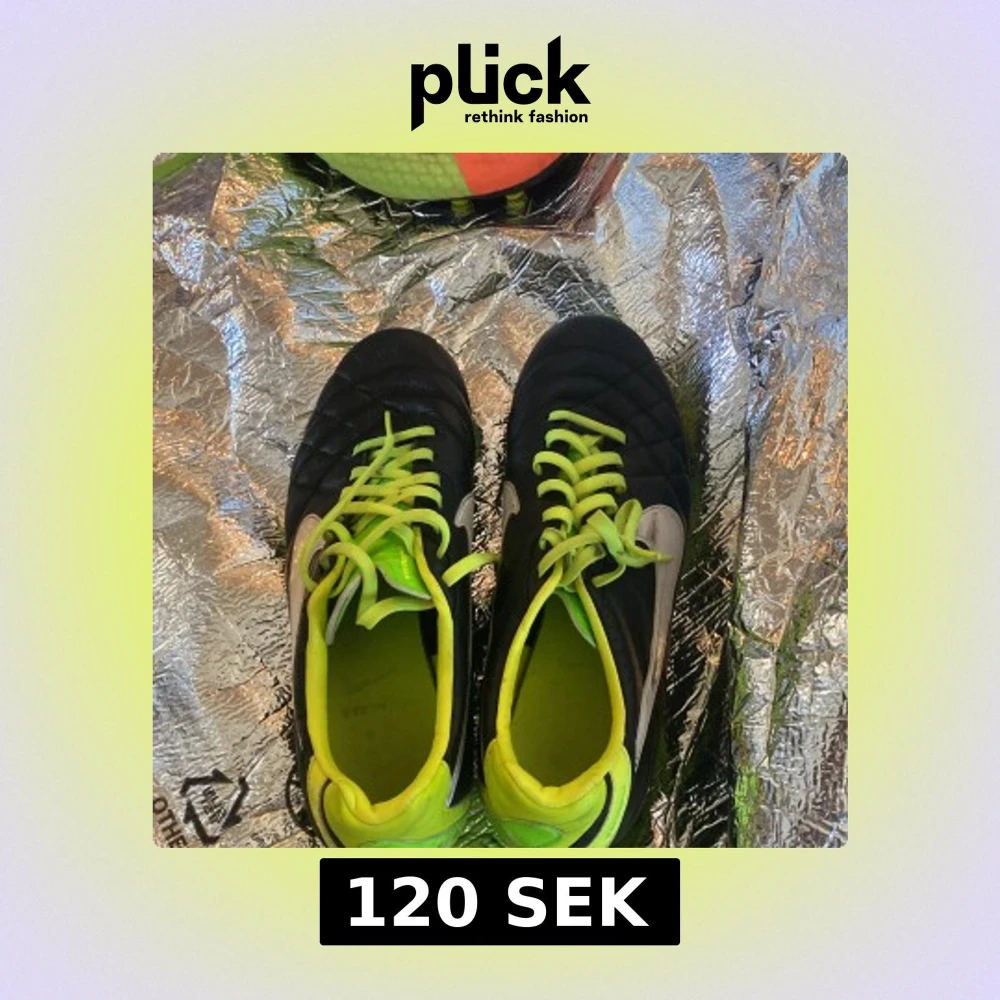 Säljer ett par svarta fotbollsskor från Nike med neongröna detaljer och snörning. Skorna har rund tå och platt sula med fasta dobbar, perfekt för spel på gräsplan. Swoosh-logga på sidan och insida.