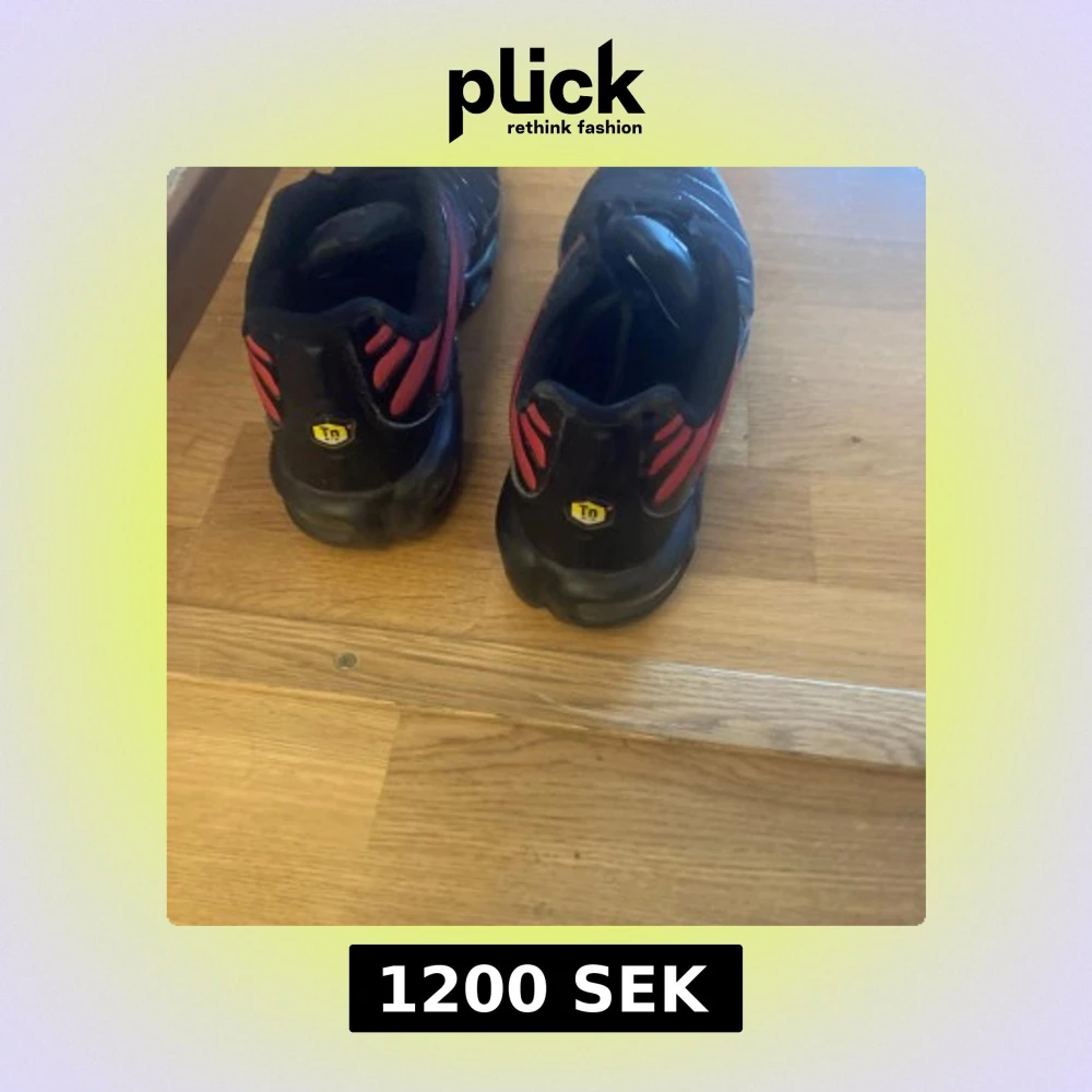 Säljer ett par svarta och röda Nike sneakers med TN-logga på hälen. Skorna har en sportig design med snörning och en bekväm sula. Perfekta för en casual look eller träning. Knappt använda.