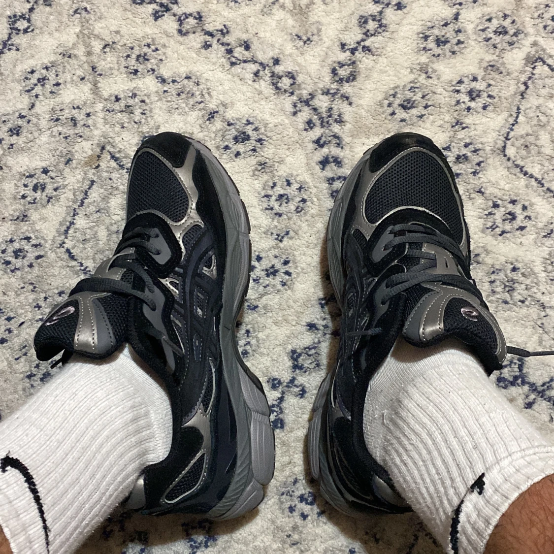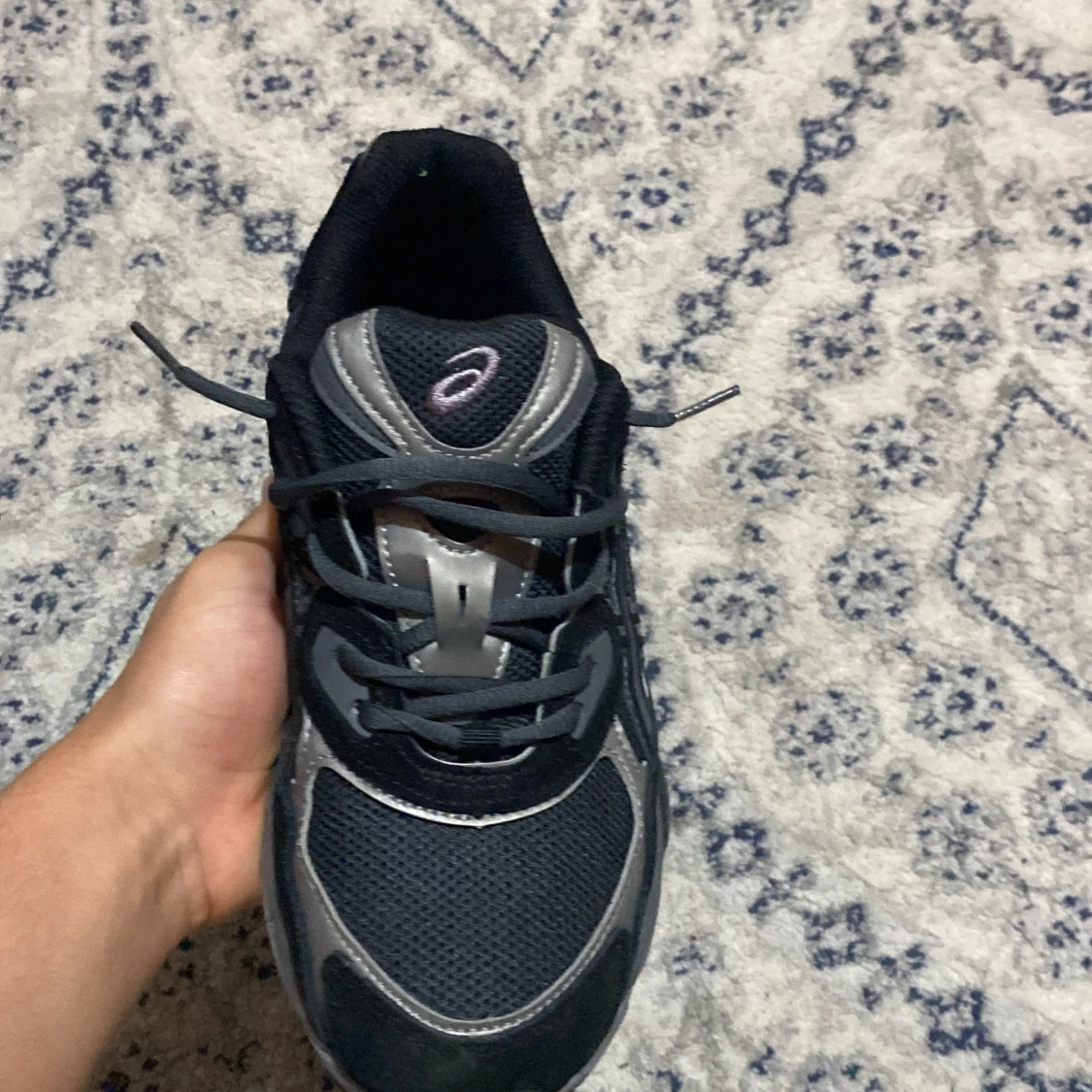 Säljer ett par snygga Asics sneakers i svart och silver. Skorna har mesh- och syntetpaneler, klassisk snörning och rund tå. Perfekta för dig som gillar sportig stil och vill ha bekväma skor till vardagen.
